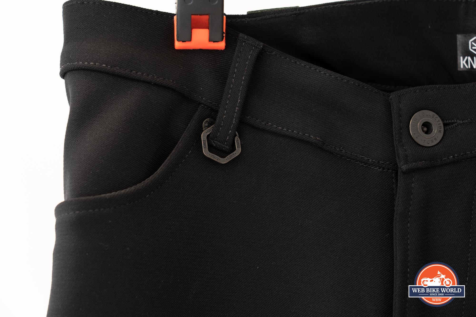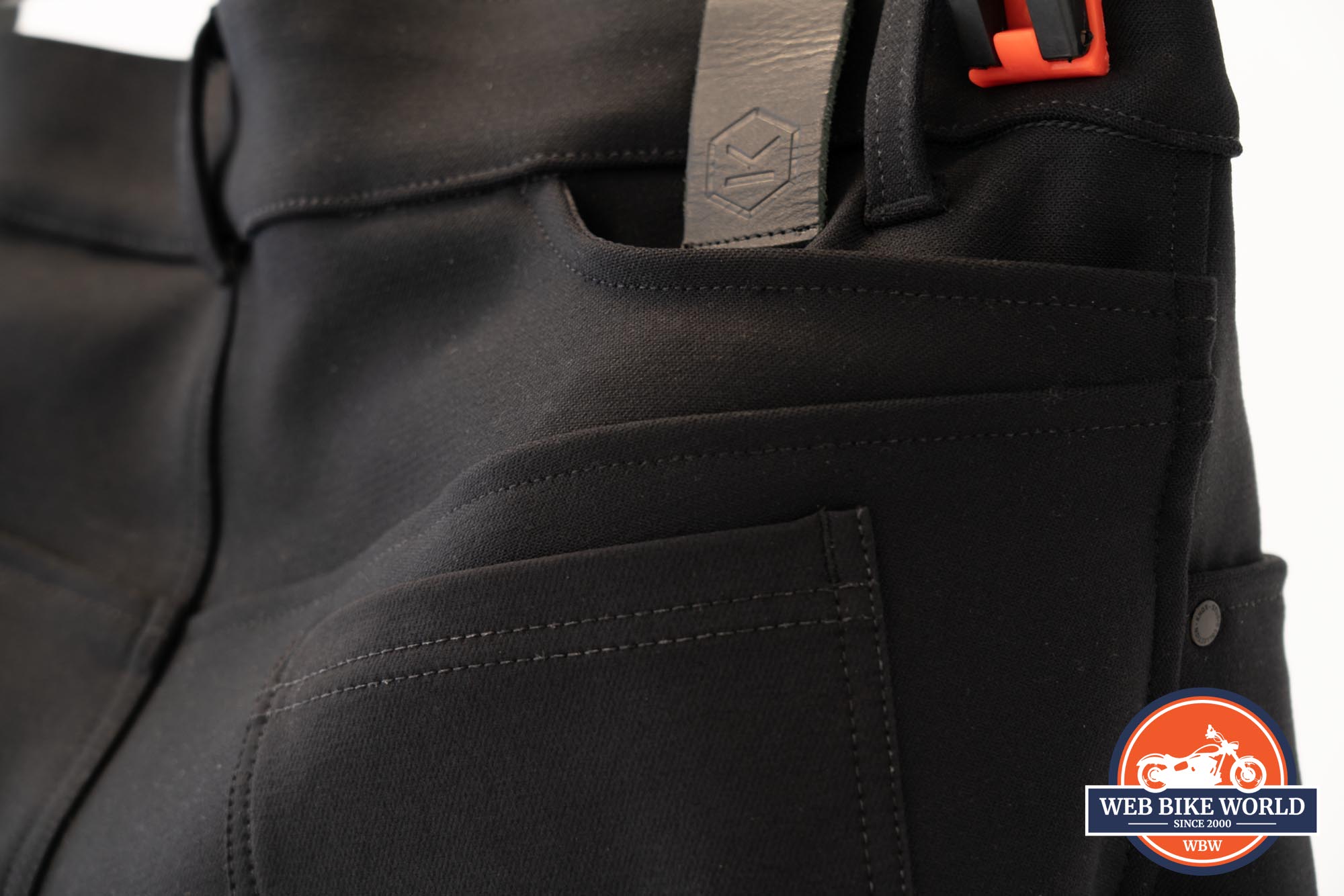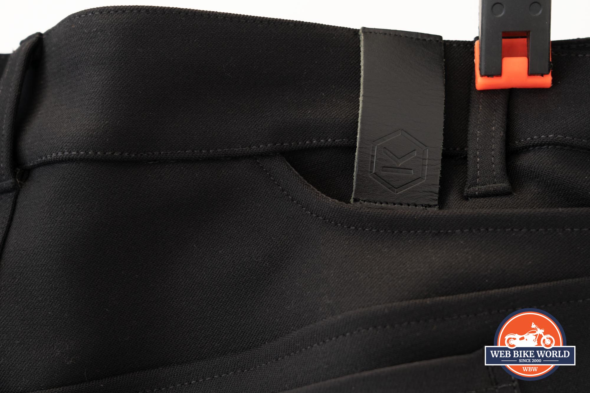 Branding is very subtle, with only the Knox hexagon-around-K logo embossed on a black leather patch along the waist. One could also argue the hexagon-shaped key ring sewn on the front right of the pants is also an iteration of the Knox logo, but that might be a stretch. Suffice to say that besides some very small print on the waist button, the word Knox is not visible on the outside of the pants.