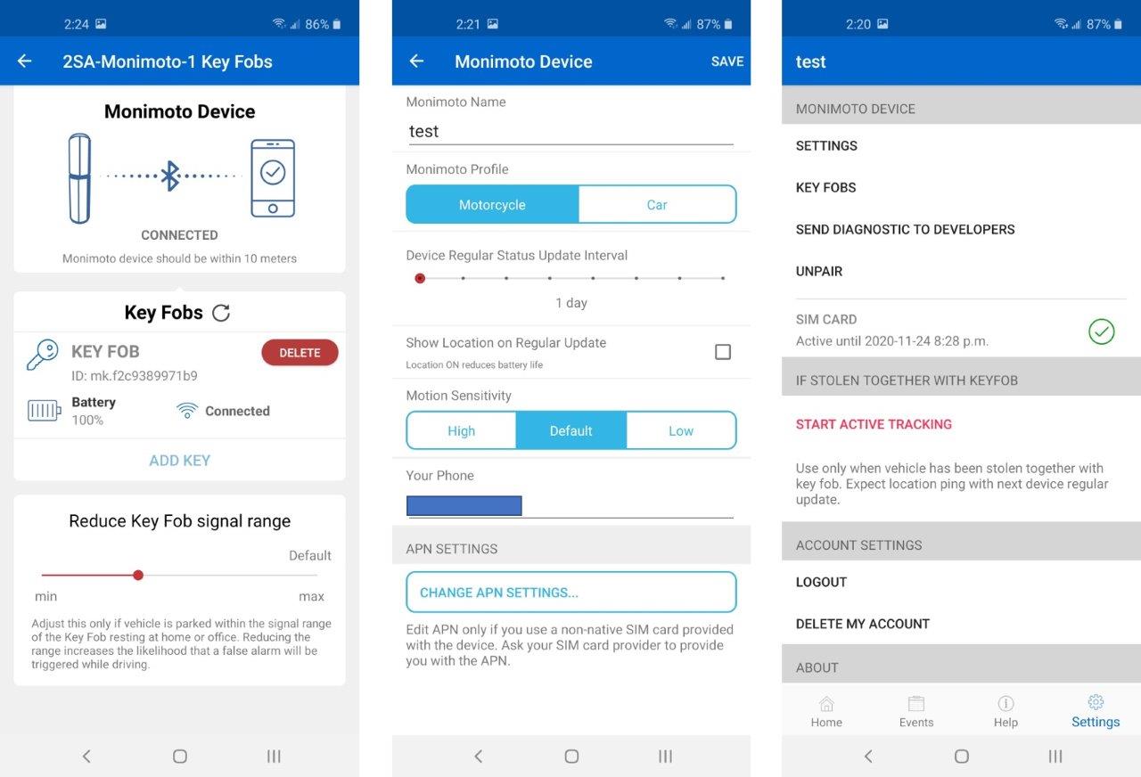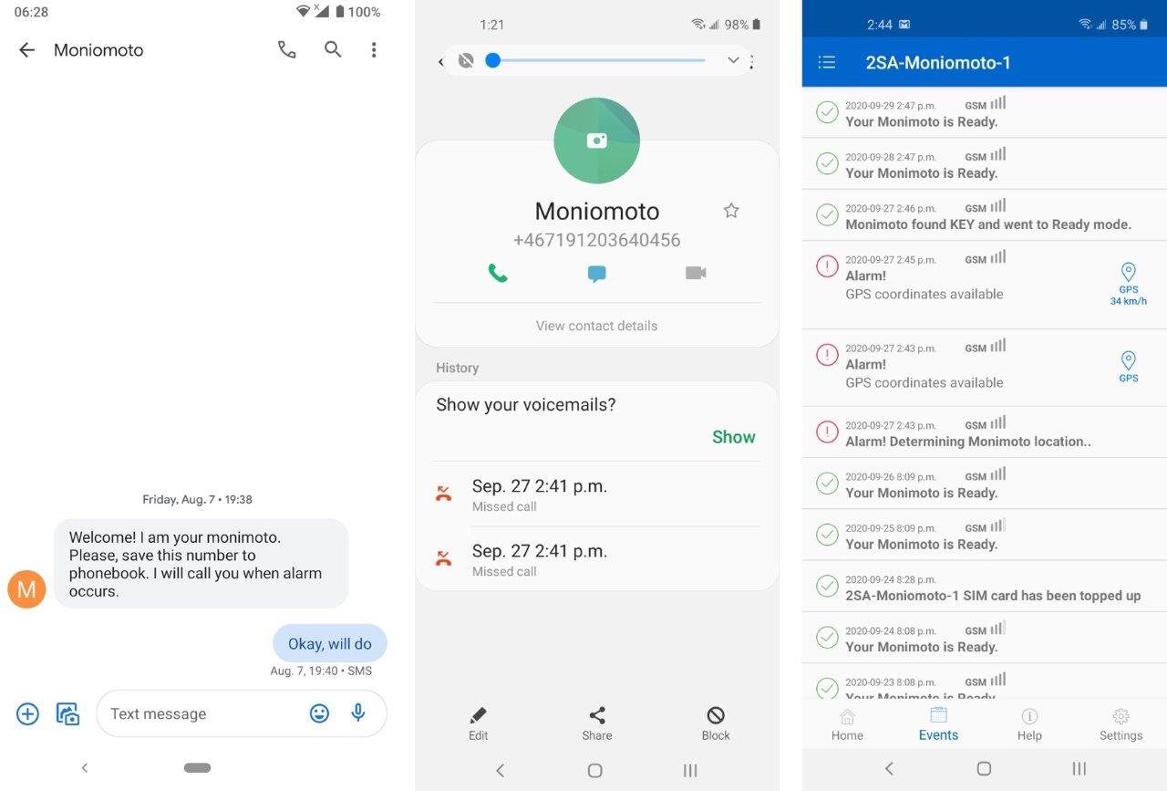 Monimoto is smart in that it automatically arms and disarms itself based on validation or movement conditions and activates needed communication means so that system integrity is maintained. It also provides system status, including battery state, updates to your phone.
