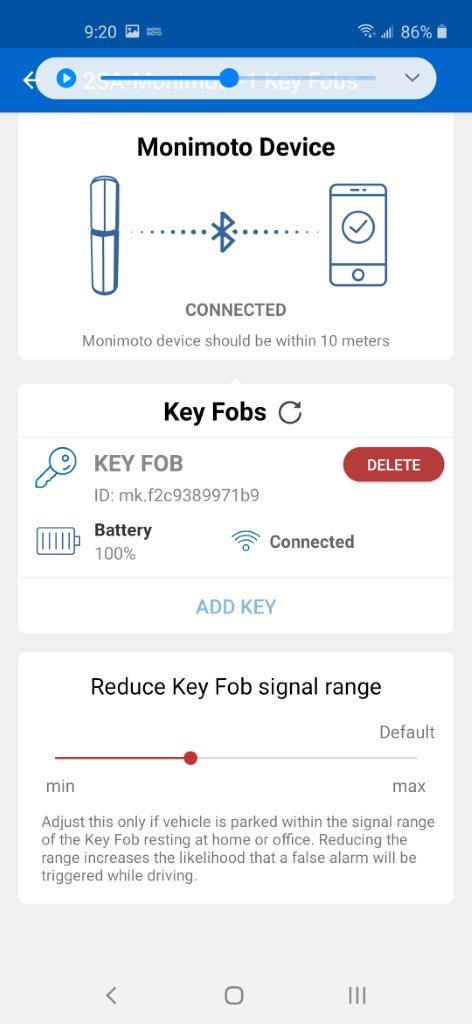 The Keyfob will restart and the screen refreshes and you will see if the Keyfob still connects (active screen vice greyed out). If it connects easily, reduce the range slider in increments until the Monimoto device no longer links (connects) to the Keyfob; this helps battery life, but also increases the chances of false alarms being triggered during use.