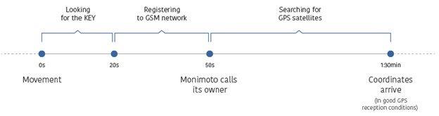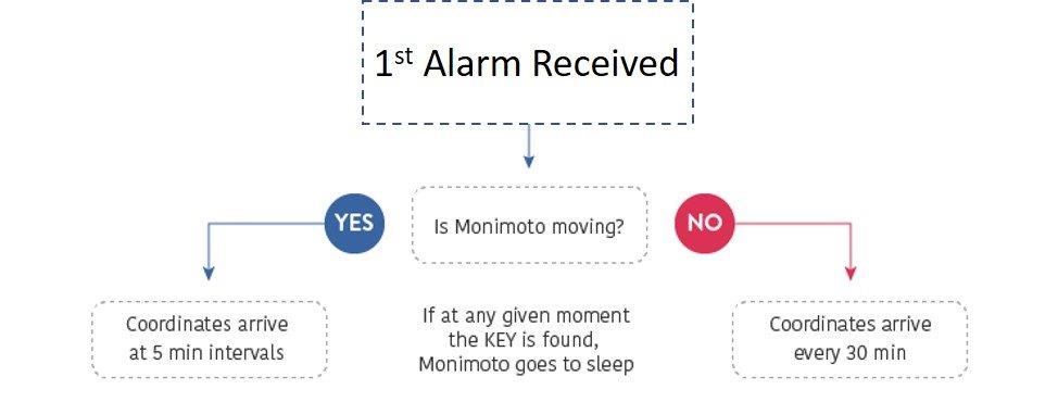 Important note: If the motorcycle stops moving, an update is sent within 30 minutes, but only once, then Monimoto goes back to Ready Mode but reactivates Alarm Mode if it detects movement again.