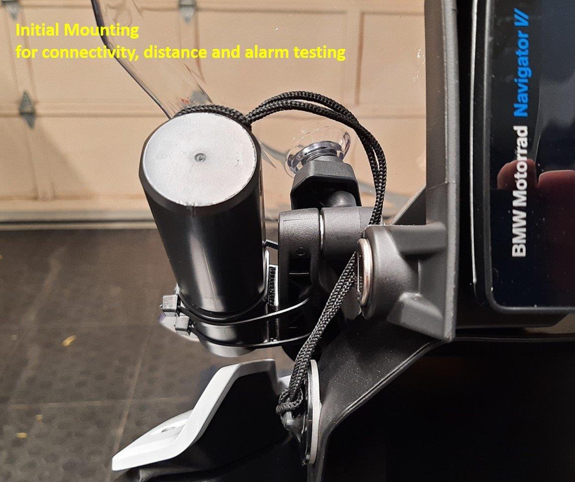 Testing Success – per the Monimoto instructions, the Keyfob is left on the garage workbench, the Monimoto App exited, and BT turned off on the phone (for this initial test). The Monimoto equipped motorcycle is taken out for a test ride up around our main drive that exits on to a main city road, so about 600m line of sight from the house (50m or 165ft is recommended).