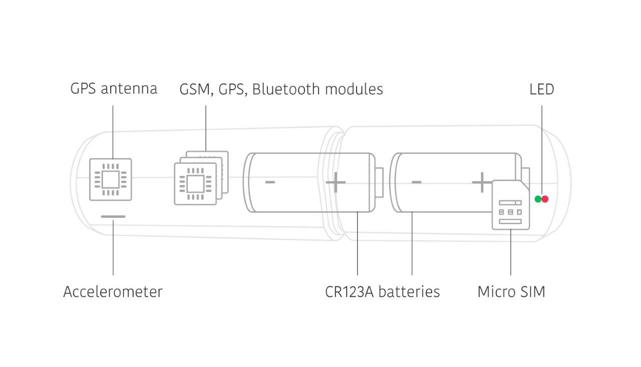 Monimoto Module – the core of the system is contained in a slender tube-shaped housing with tightly fitted removable sections. The module houses: the GPS antenna; Accelerometer; GPS, SIM (GSM), and BT modules; system processor; SIM card slot; and batteries.