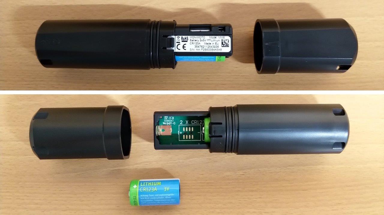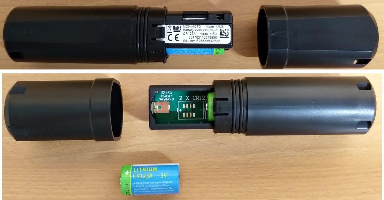 - Monimoto device module powered by two single-use long-life batteries (CR123A)