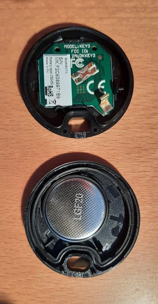 Monimoto Keyfob – the companion component is the Monimoto Key or Keyfob, a round plastic housing with electronic components and battery inside to provide wireless BT communication between it and the Monimoto module.