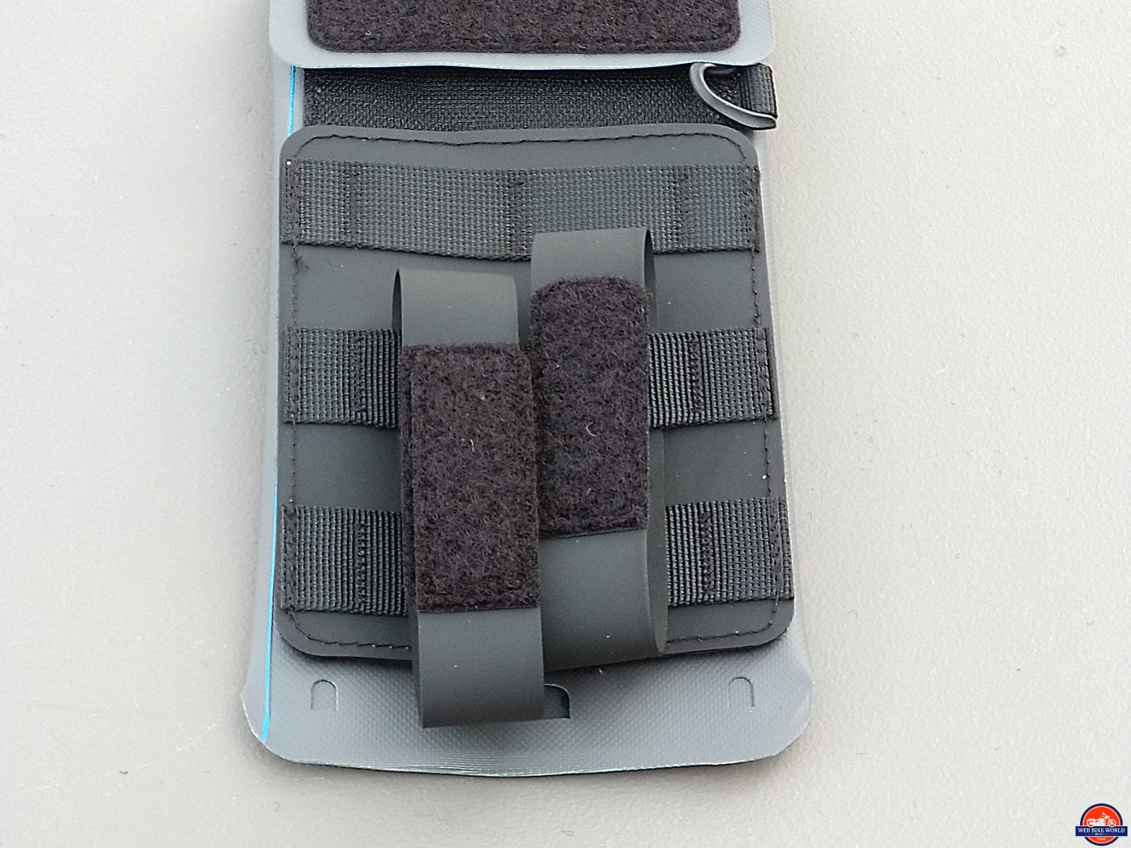 With the Velcro strips interleaved through the MOLLE strip side of the pad and the target MOLLE prepared surface such as found on the Pico Tank Bag (V2.0) and other Mosko Moto products, the two MOLLE surfaces are secured together leaving the large Velcro (loop) side up.