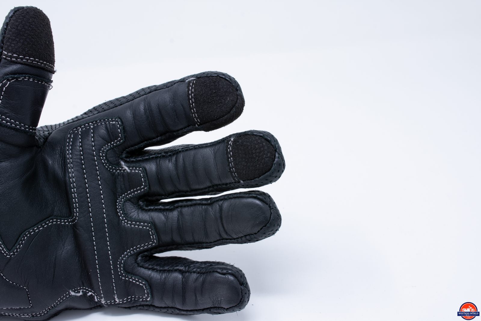 The tops of the fingers are a mix of accordion leather, a rubber finger guard, and perforated leather. The overall finishing of the cuts and stitching is okay. The bottom of the fingers is solid leather, save for the tips of the thumb, index, and ring fingers, which have a small patch of conductive material.