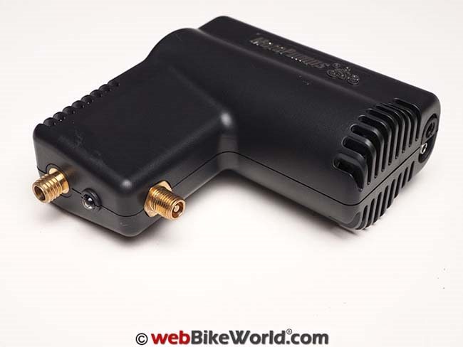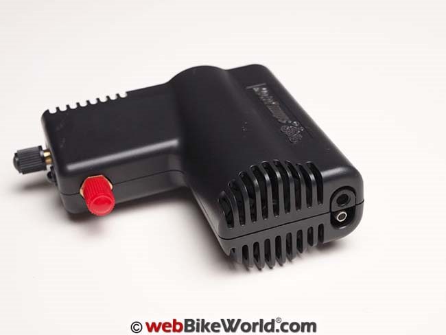 The Air Shot air pump looks like tiny, pistol-style hair dryer and at the end of what might be considered “the barrel” is a standard SAE connector for power.
