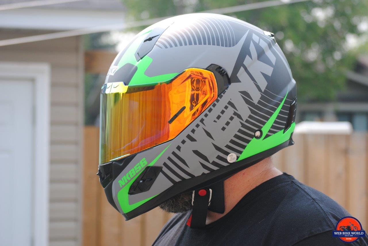 The NK856 does not allow for a full peripheral view. The visor edge is a bit forward and a visor lock that does very little in keeping the visor from opening or closing is always in the corner of your eye.