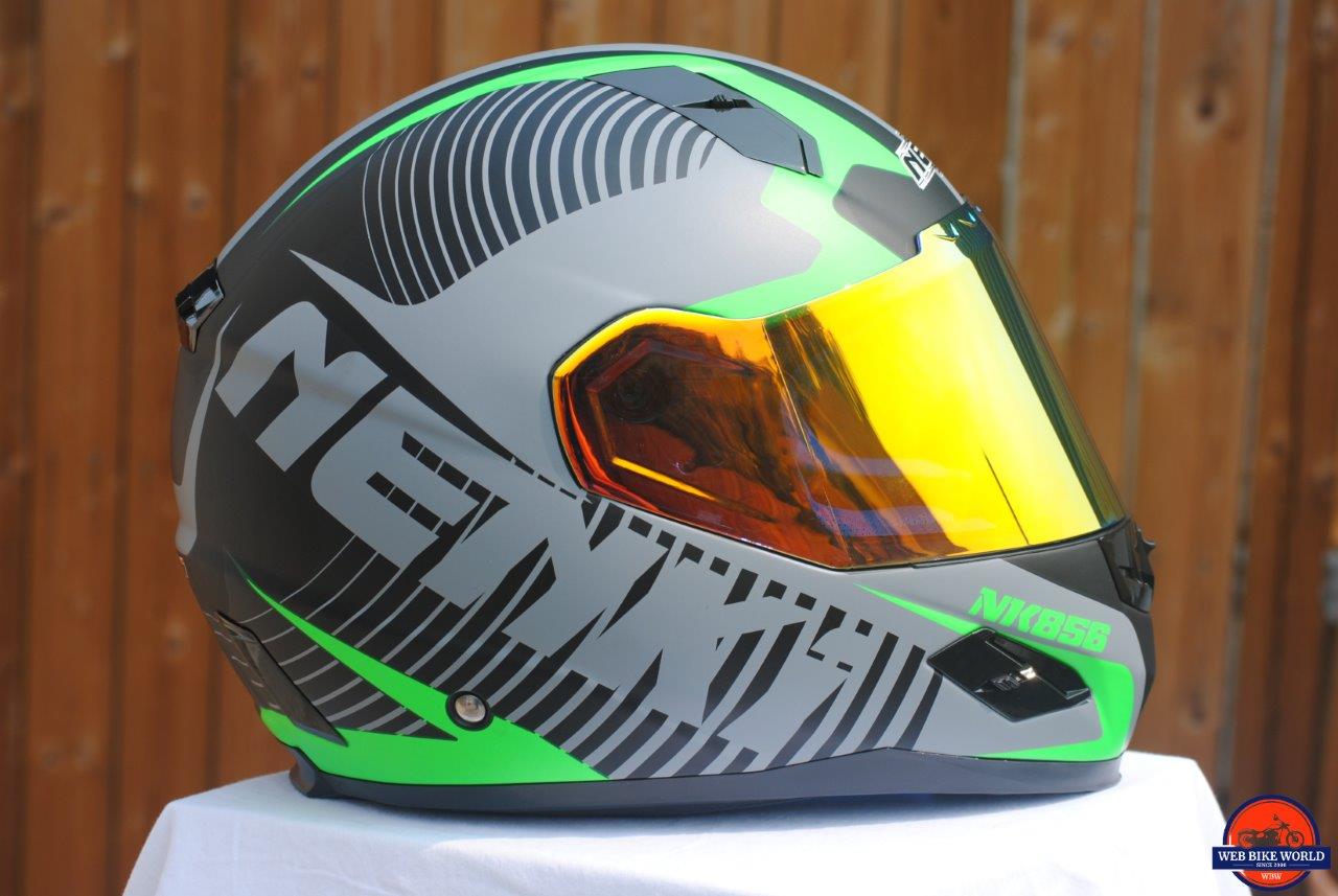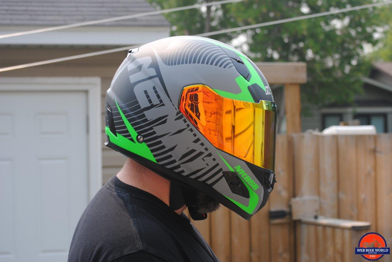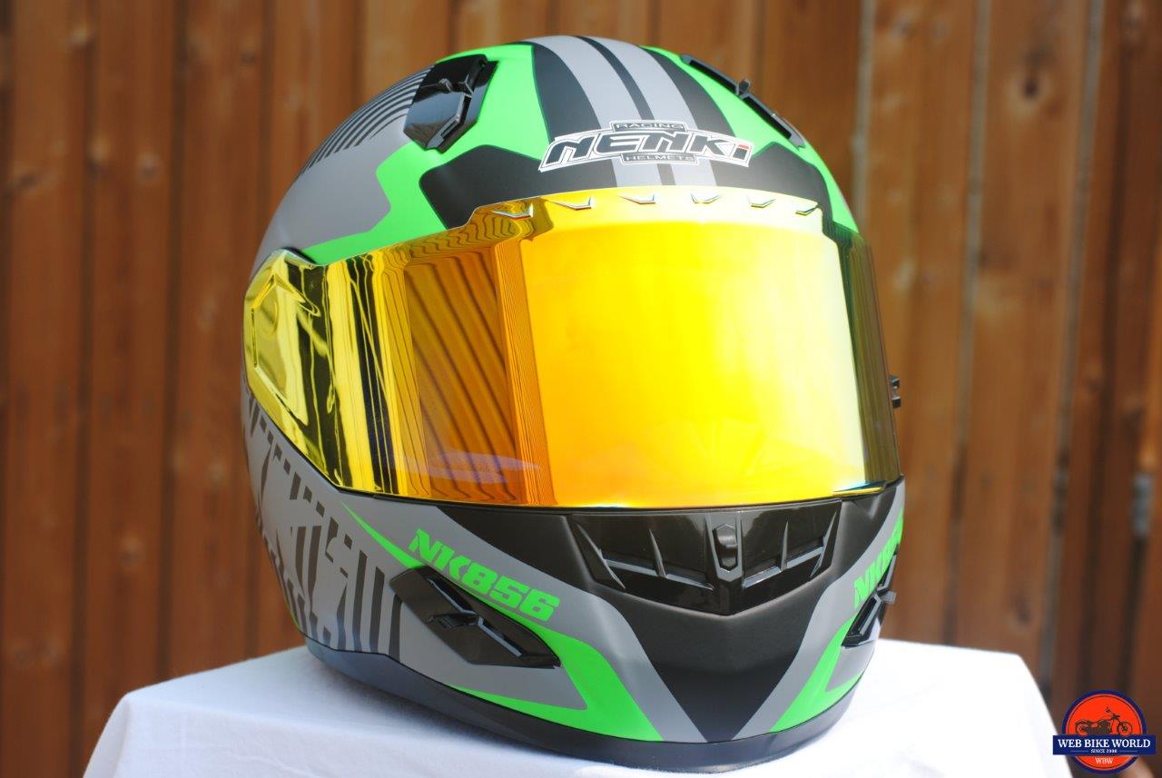 The helmet comes with an anti-fog chrome visor that has a shade of gold. The visor accentuates the matte black and green graphics of the helmet.