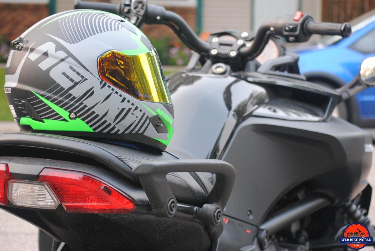At one point, while riding with fellow writer Jim Pruner, we switched bikes and I found myself on his Kawasaki H2 SX SE. The forward riding position made me feel like the helmet was not allowing me to properly open or close my mouth. The padding was very tight against my face and it felt like I was biting the inside of my cheeks.