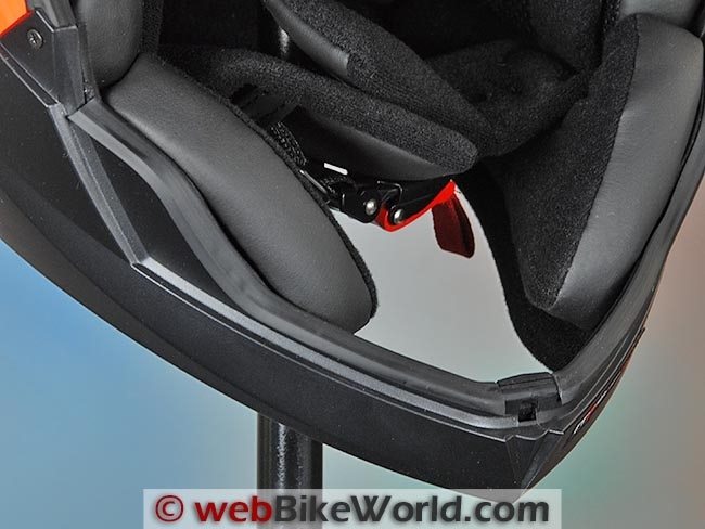 Like the X30, the X30V has a unique one-piece helmet base system that includes a narrow chin bar across the front. The rotating visor snaps into this chin bar to form what is likely to be a more robust protective shell than most flip-up helmets.