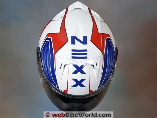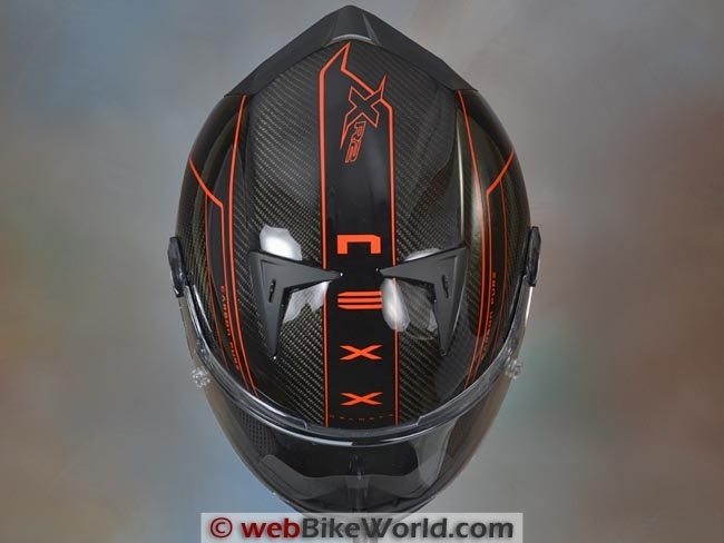 The top vents work to bring air into the helmet when the head is tilted slightly forward on an unfaired bike, but the air flow tends to weaken when the rider is sitting upright.