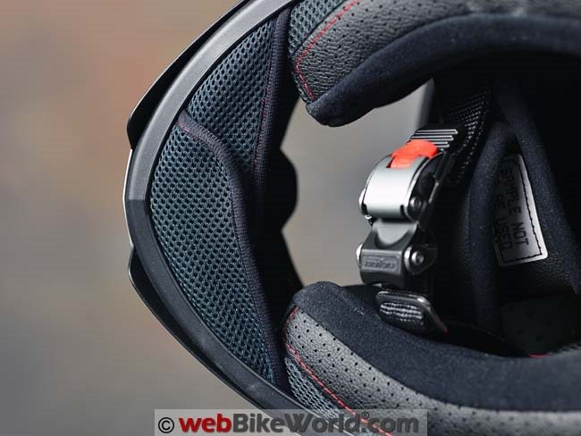 The Nolan N87 (like the N86 before it) has the Nolan “Microlock2” chin strap retainer, which works well. The padding is nice and thick and long enough to protect the rider’s neck. The N87 sold in the U.S. meets the DOT standard and helmets sold in Europe meet the ECE helmet safety standard. The N87 will be available in the U.S.A. starting in January 2017.