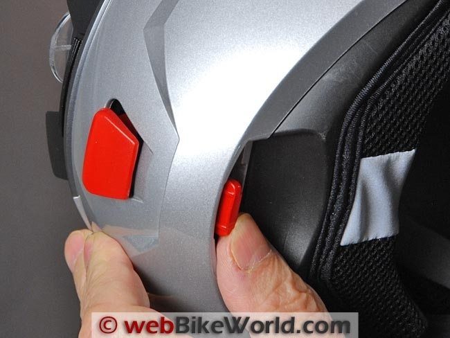 To lift the visor, pull out the small red tab under the chin bar and a second red tab, located just below the chin vents, also pops open. Squeeze both tabs and you get a nice “handle” to lift the visor.