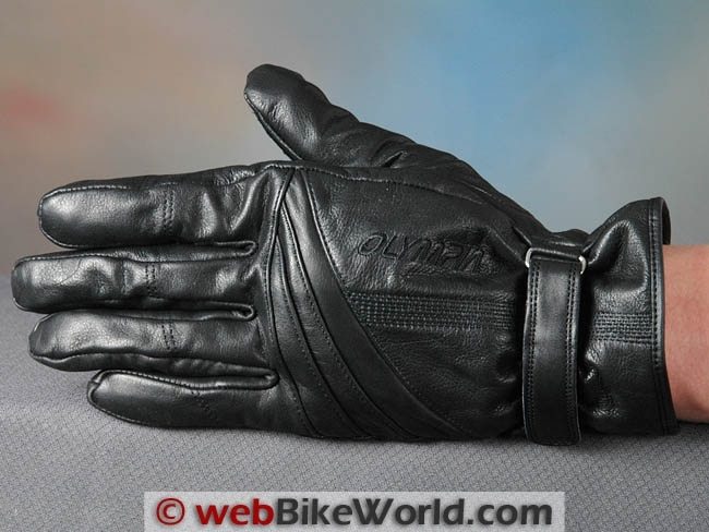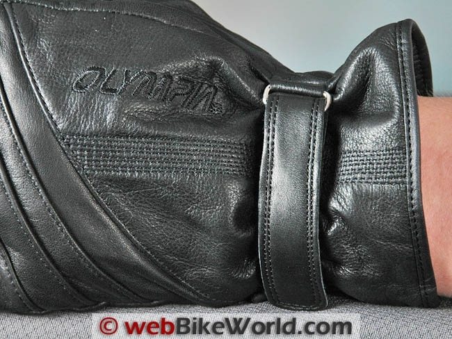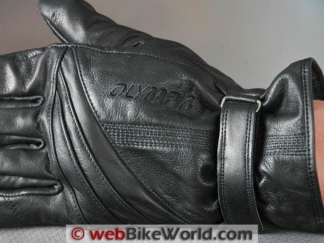 The gloves also have a fairly hefty hook-and-loop leather strap across the back of the wrists that works to keep them secured. The gauntlet length is a bit of a problem; it’s too short to make these a “stunt” type glove but not long enough to go over a motorcycle jacket sleeve cuff, so they sort of bunch up between the cuff and the rider’s wrist.