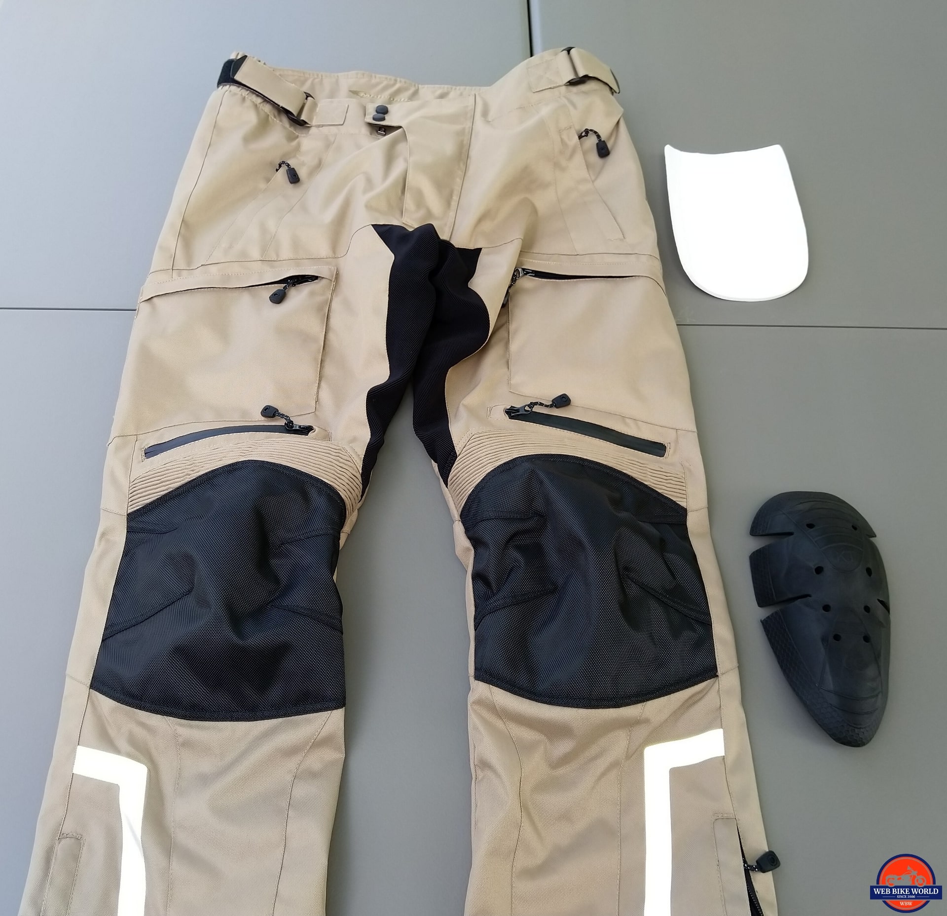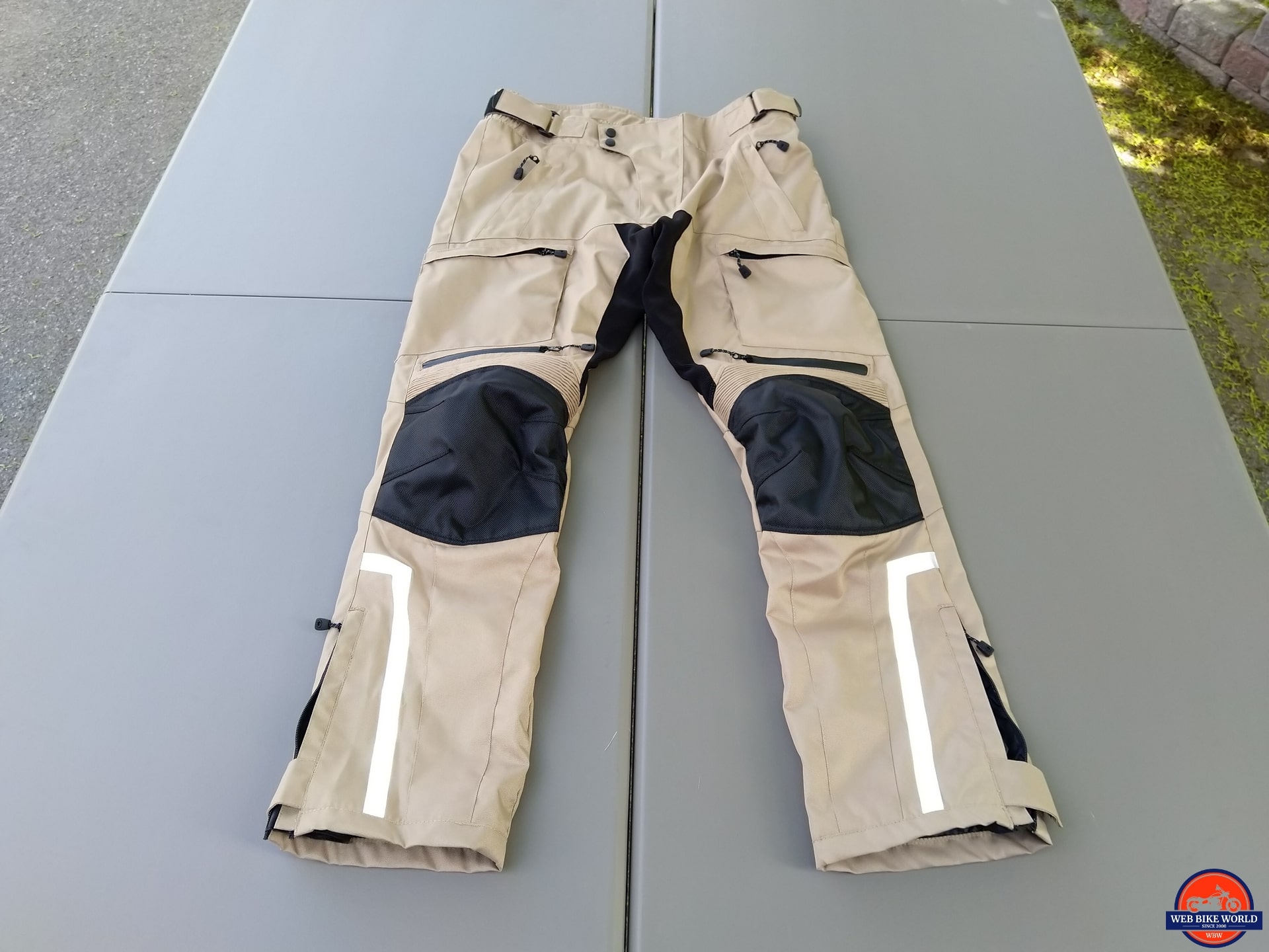 The 600D shell feels heavy-duty but is still pliable and very comfortable to wear. The Sand coloration with black crotch and knee inserts, and black zipper highlights, and a distinctive below the knee to hem reflective striping provide contrast while accentuating the styling that balances function, form, and looks… all OK with me.