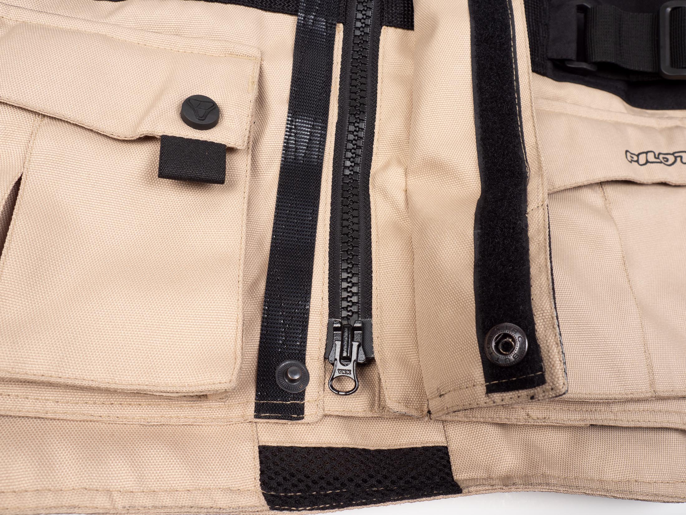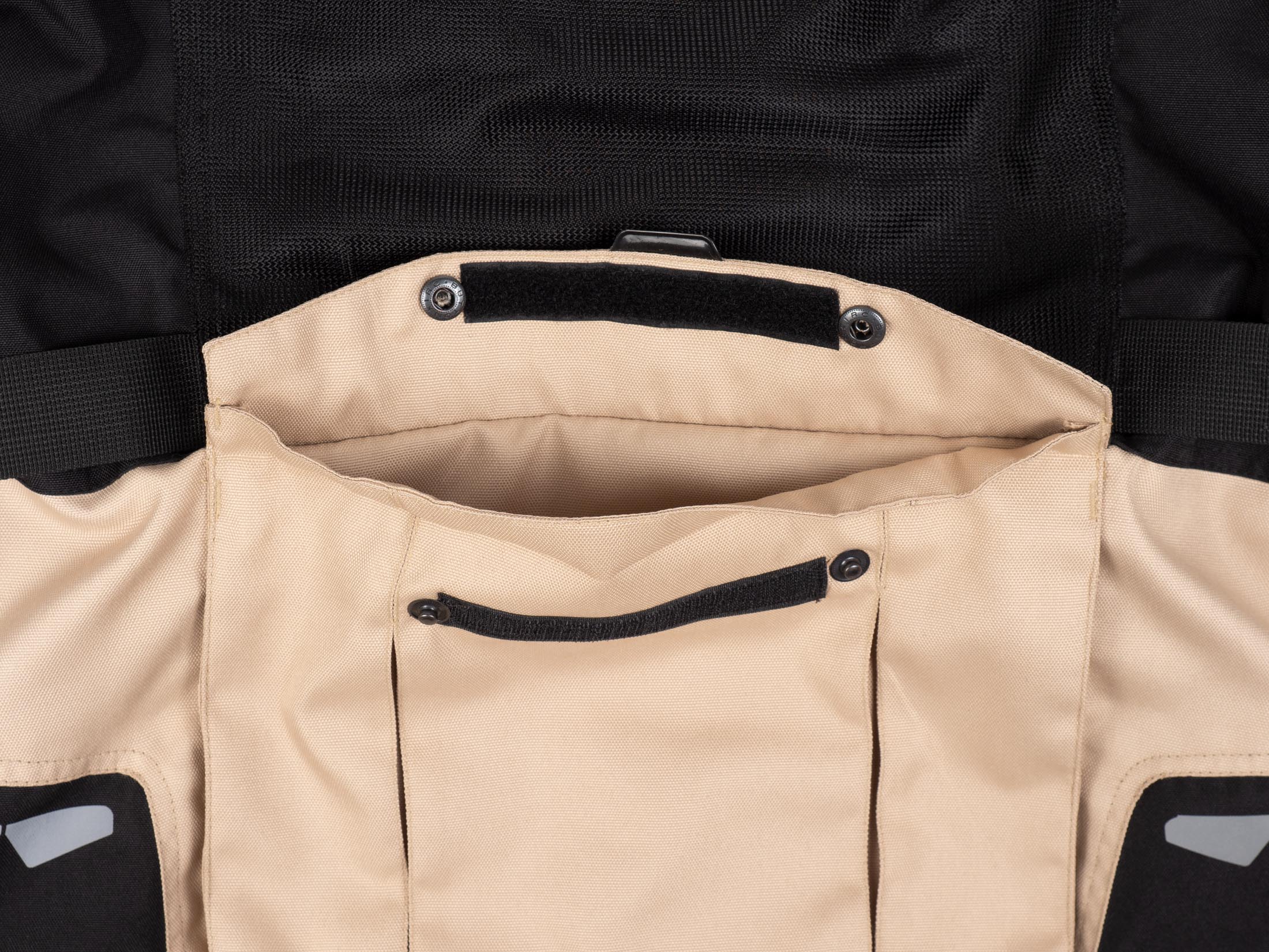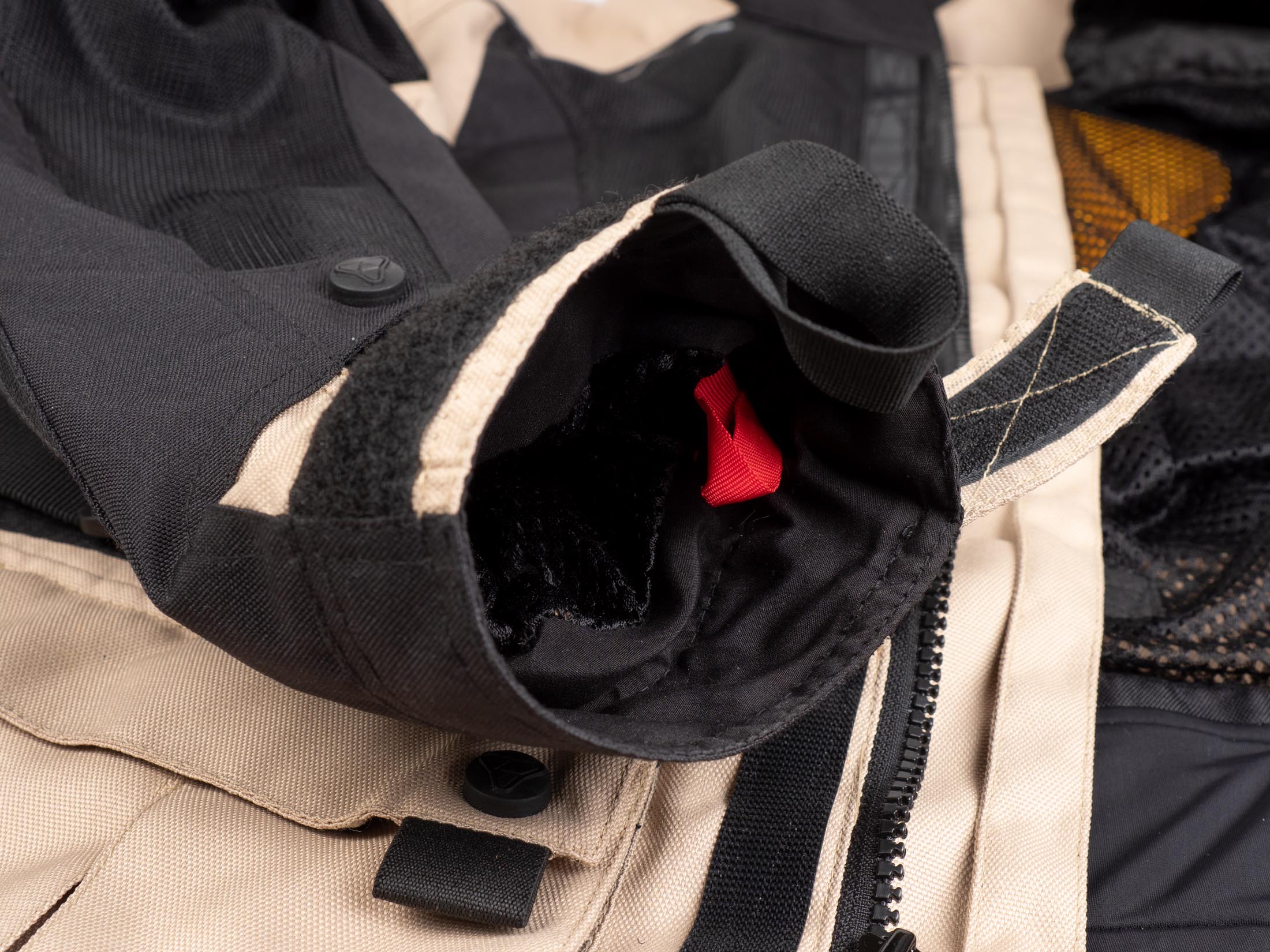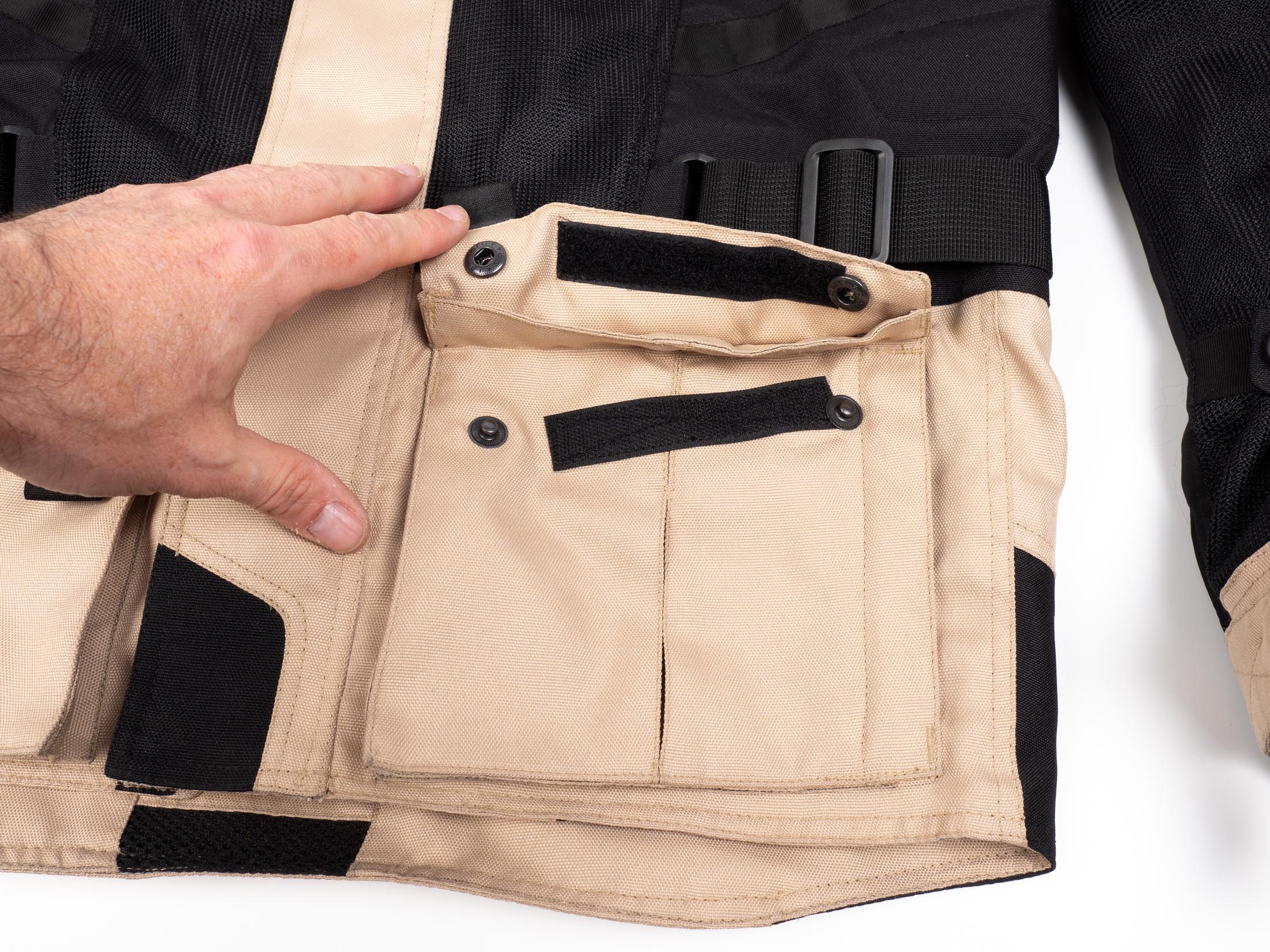 As expected for a “semi” ¾ length jacket, there is more storage than the typical sport riding type of gear. For starters, there are two front cargo pockets that fasten with a combination of snaps and hook and loop fastener. The pocket opening also folds over when closed to make the pockets water resistant, but not waterproof.