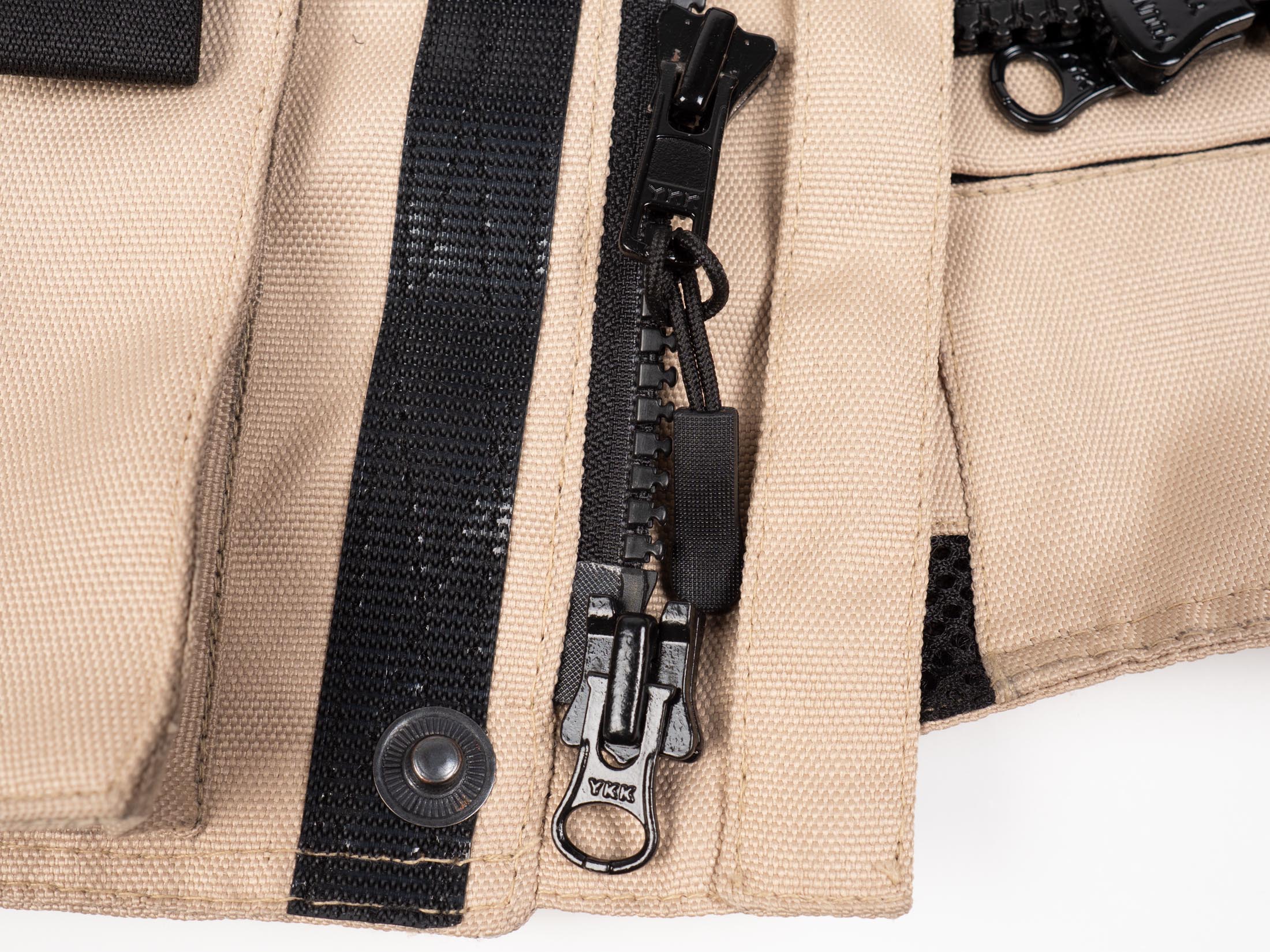 The main closure consists of a large YKK dual zipper that is then covered by a flap with Velcro® brand hook and loop fastener running in one long strip from top to bottom. There is also a snap located at the bottom edge for added strength.