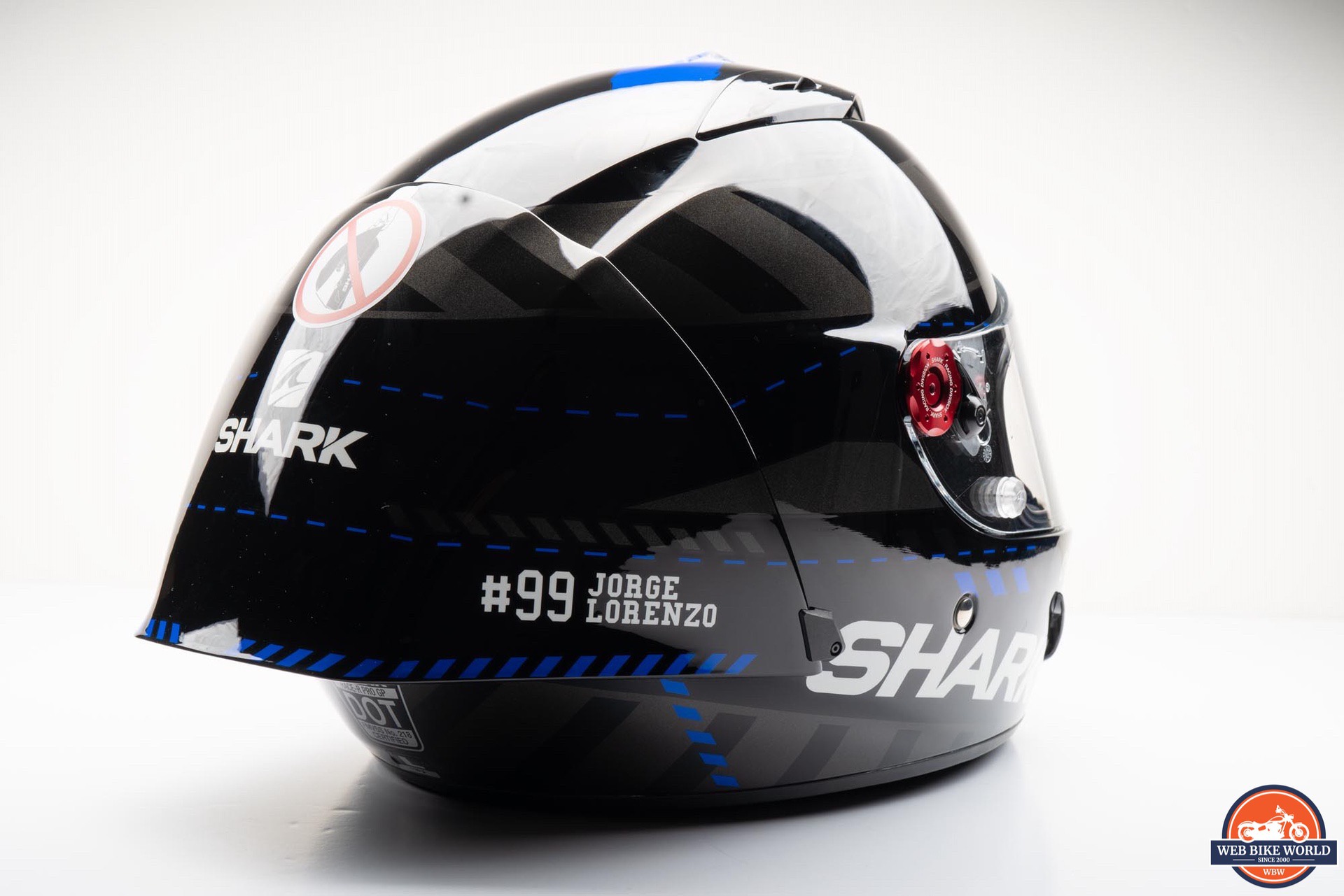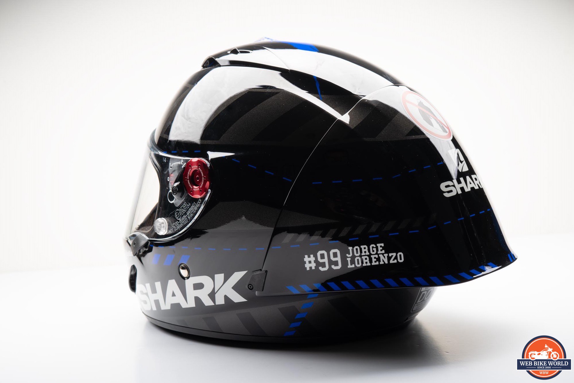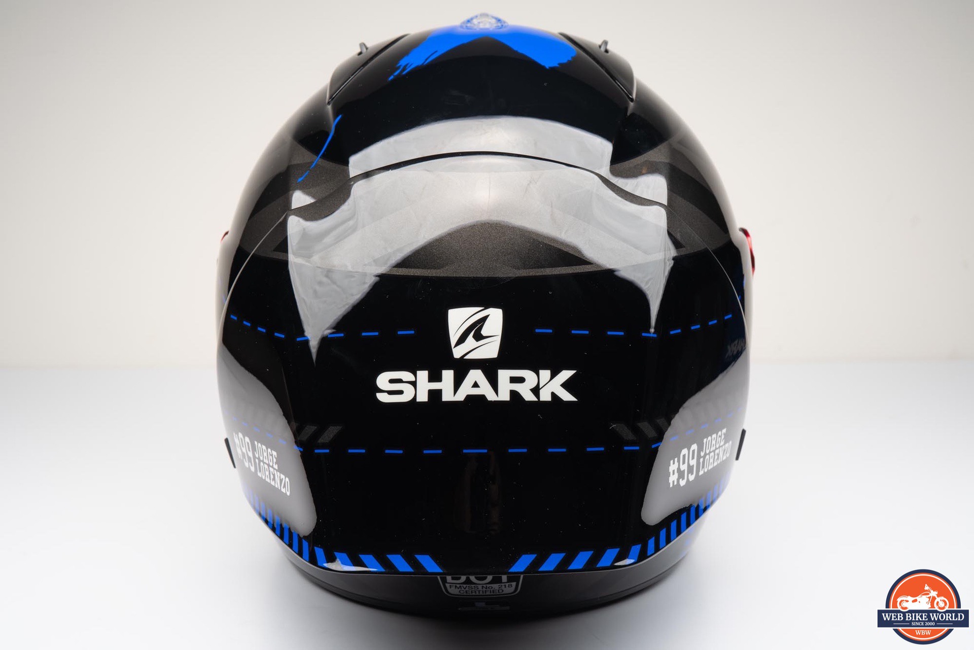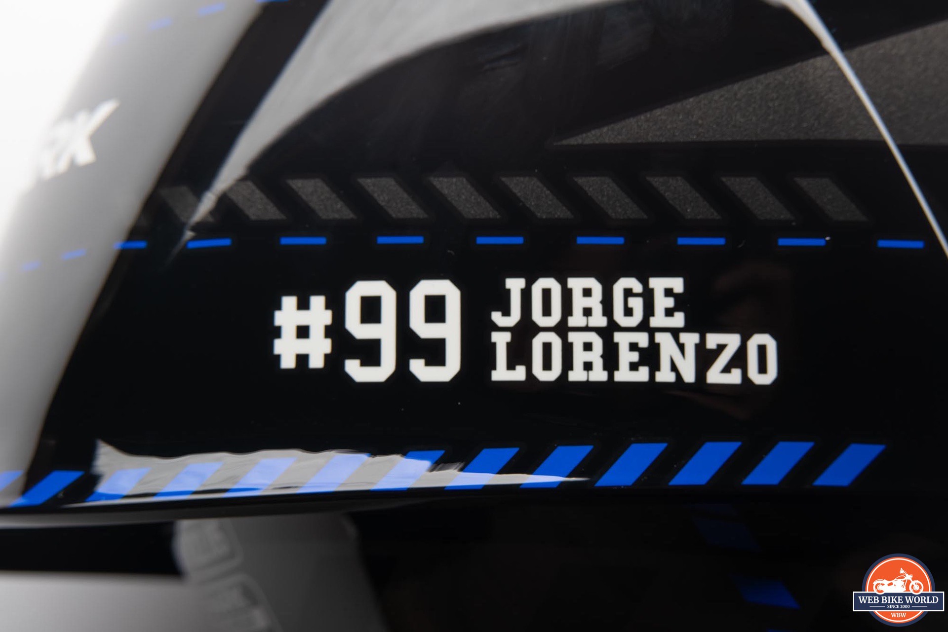 While the helmet appears mostly black, there are several dark gray block patterns around the helmet along with some blue accents and a large, blue “X” graphic on the top. On each side of the spoiler is a “#99 JORGE LORENZO” decal in white along with several SHARK logos around the rest of the helmet.