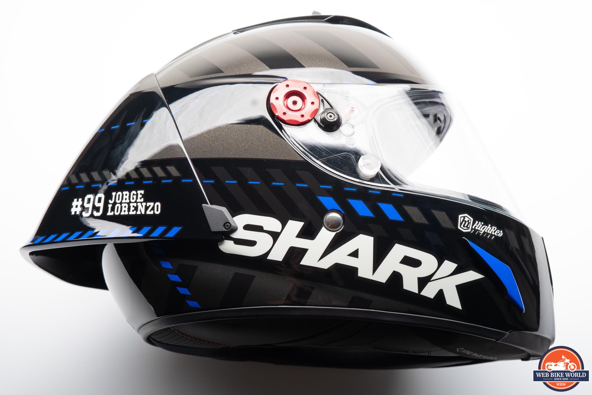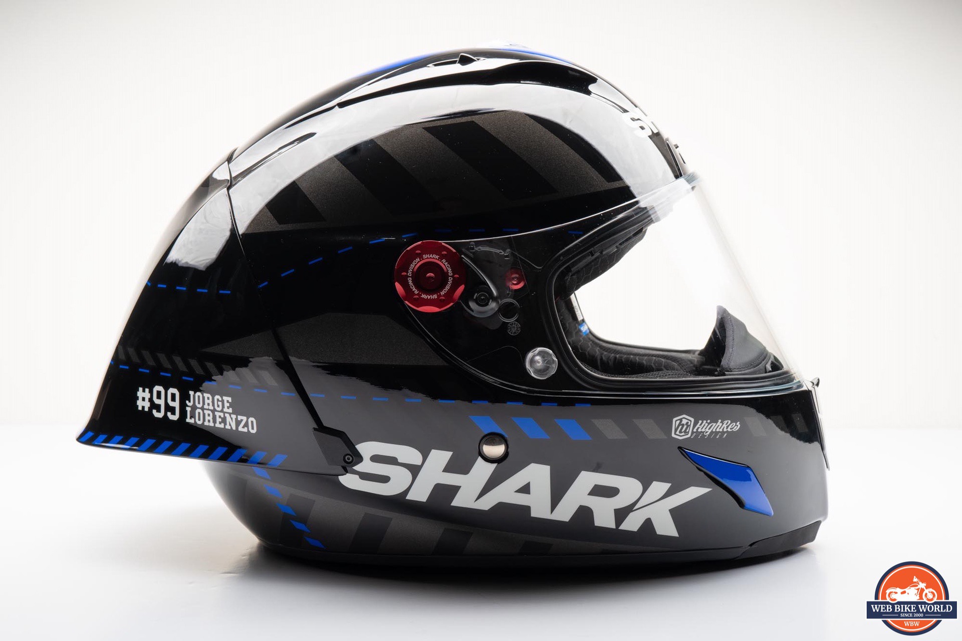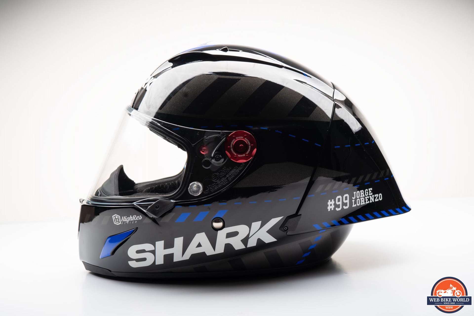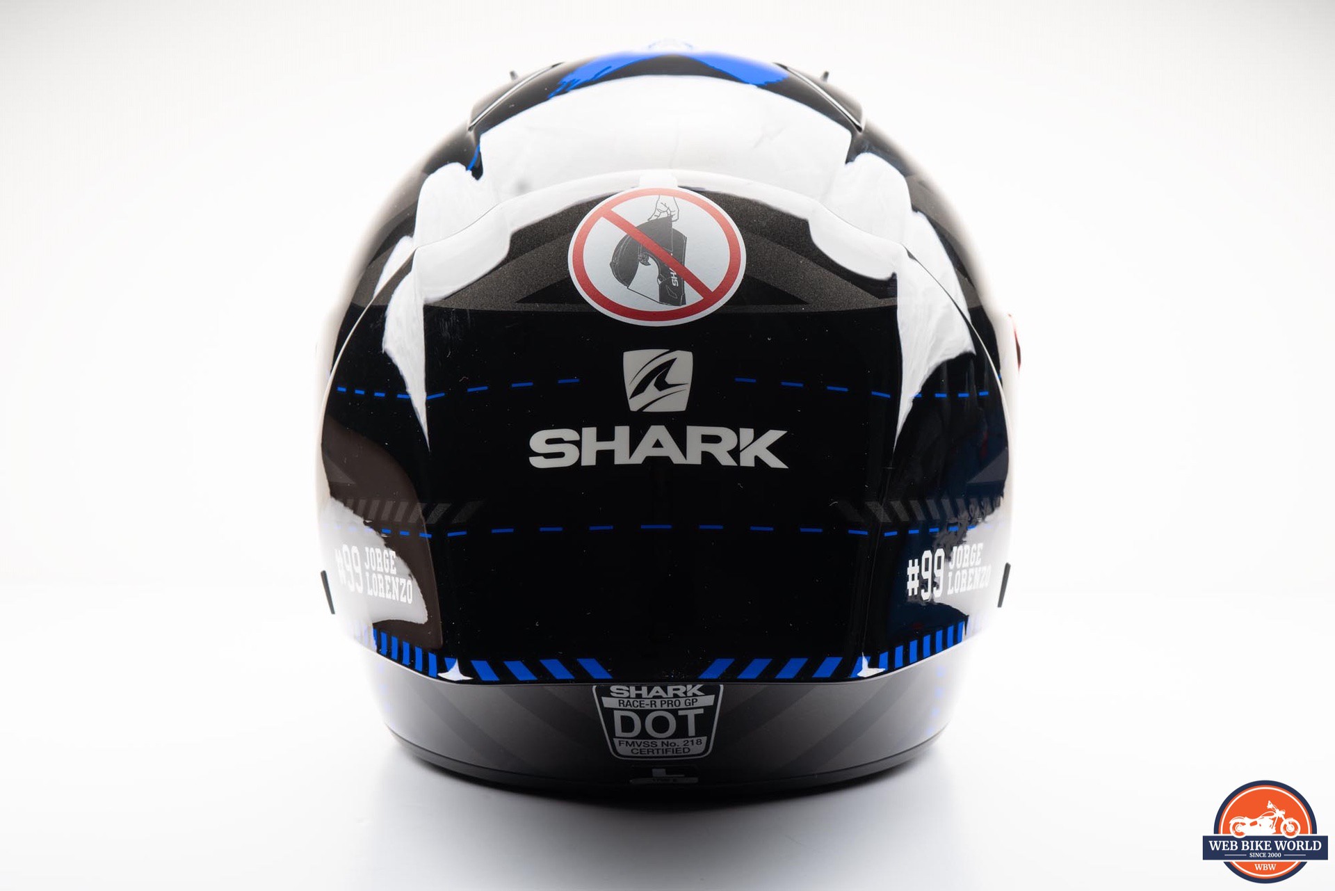 While the helmet appears mostly black, there are several dark gray block patterns around the helmet along with some blue accents and a large, blue “X” graphic on the top. On each side of the spoiler is a “#99 JORGE LORENZO” decal in white along with several SHARK logos around the rest of the helmet.