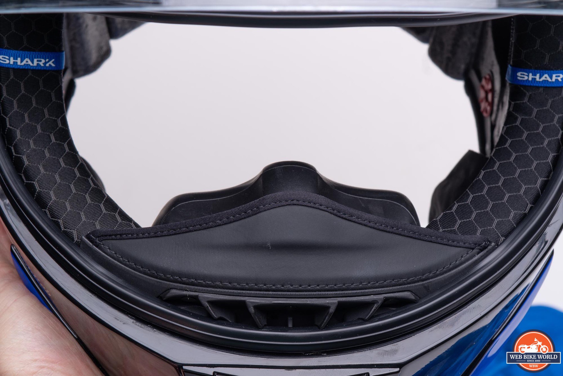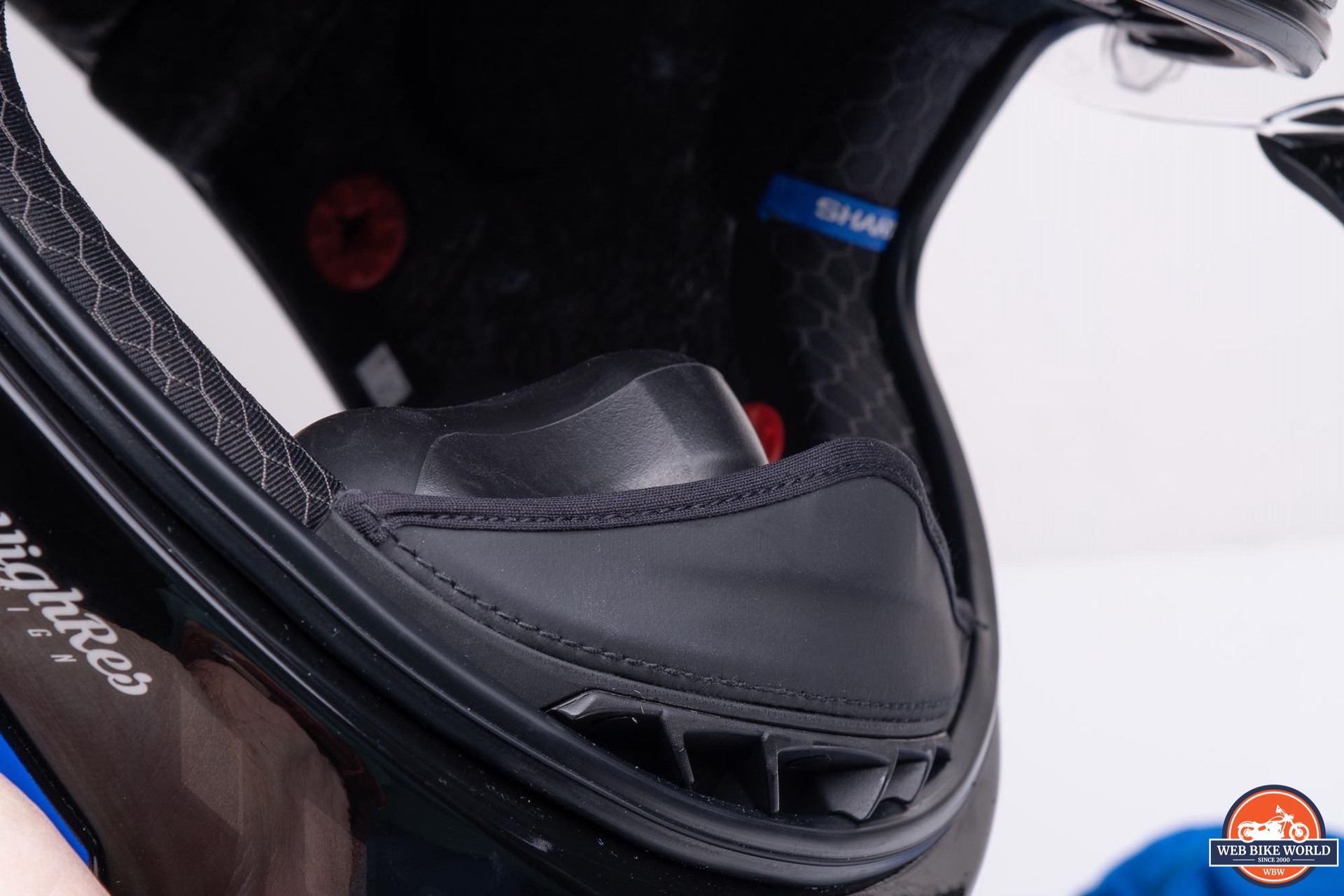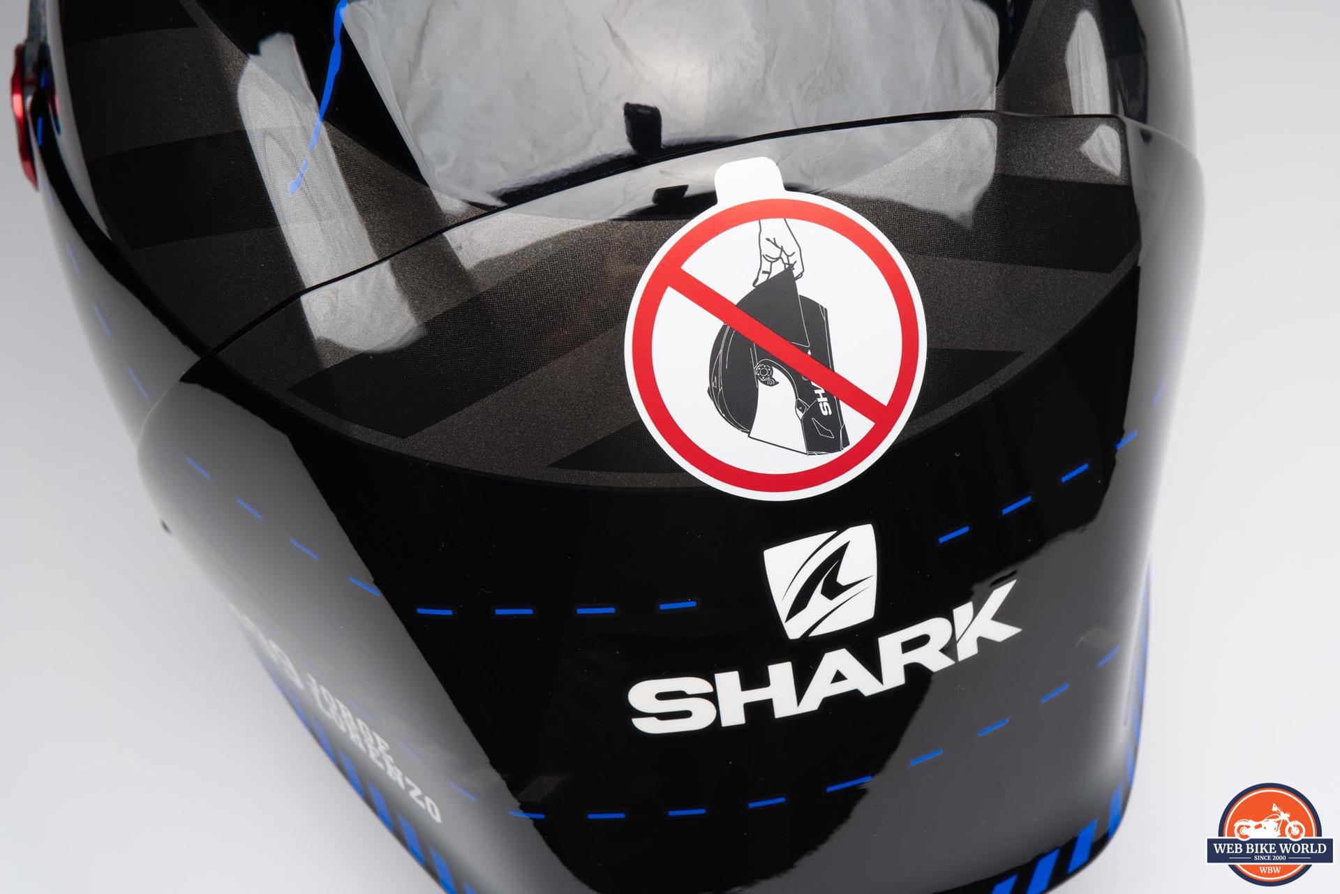 The rear spoiler is very thin, and Shark makes a point to notify the wearer that one shouldn’t pick up the helmet and carry it by the spoiler. This warning is included in the manual and also via a large, removable sticker on the spoiler. The spoiler is designed to easily break away from the helmet under impact to reduce any secondary shocks, so one should be careful to avoid putting stress on it.