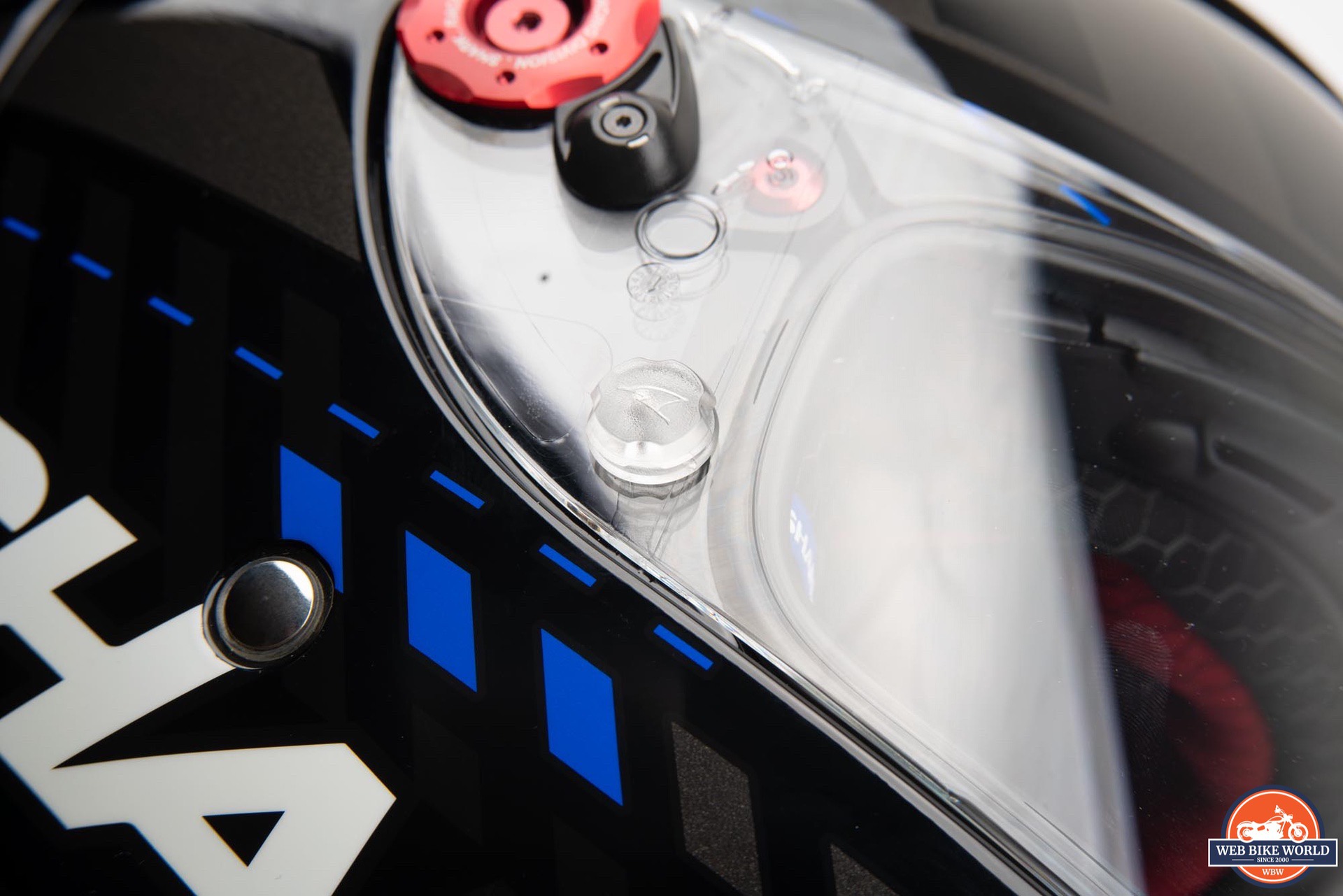 The Race-R Pro GP adds a step to this (presumably as a precaution against the high speeds associated with racing). The process is still very easy with one raising the visor to about the middle position. One can use the red fasteners under the visor on either side to line up an embossed circle in the visor plastic for reference.
