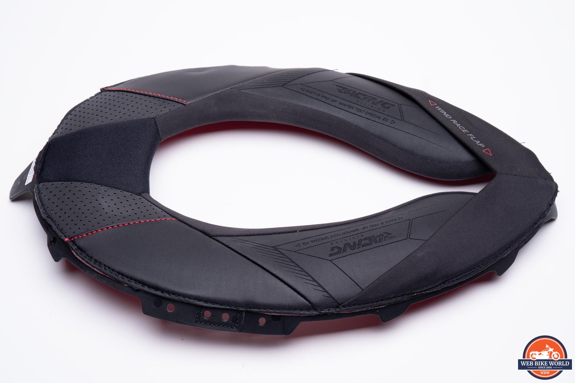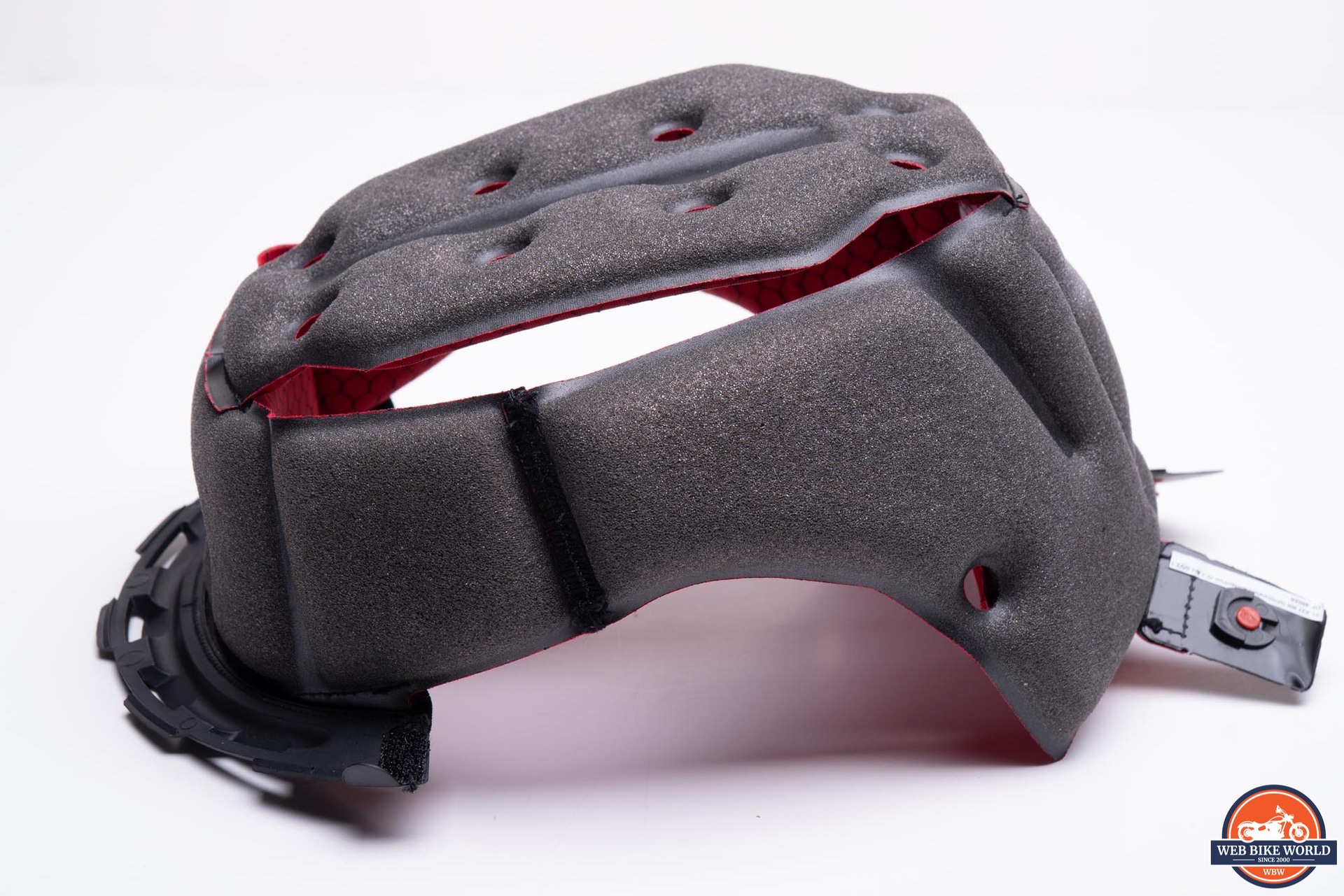 The liner and cheek pads are all removable by use of snaps, hook and loop fastener, and slots/tabs. In addition to the usual cheek pad/upper liner, the Race-R Pro uses a full circumference lower neck roll, which slots into the underside of the shell. This helps create a more snug fit around the helmet opening and can also improve noise reduction.