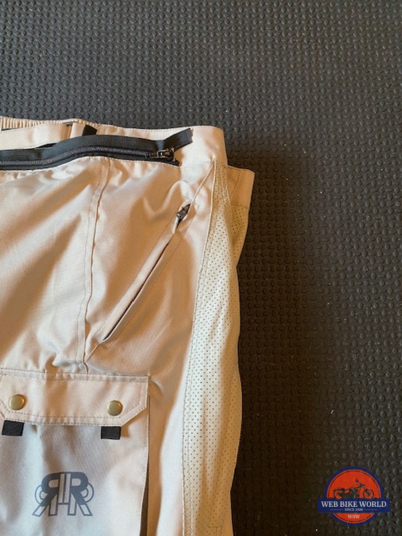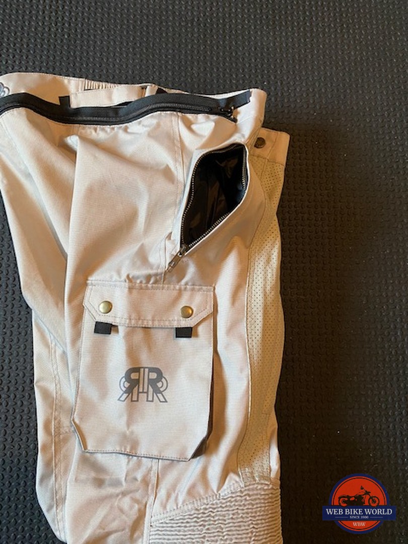 The two side cargo pockets are secured by metal snaps that provide easy access to the pockets thanks to the pull tabs located below each snap. The zipper at the back of the waistband mates with all Raven Rova jackets to provide total comfort and protection from head to toe.