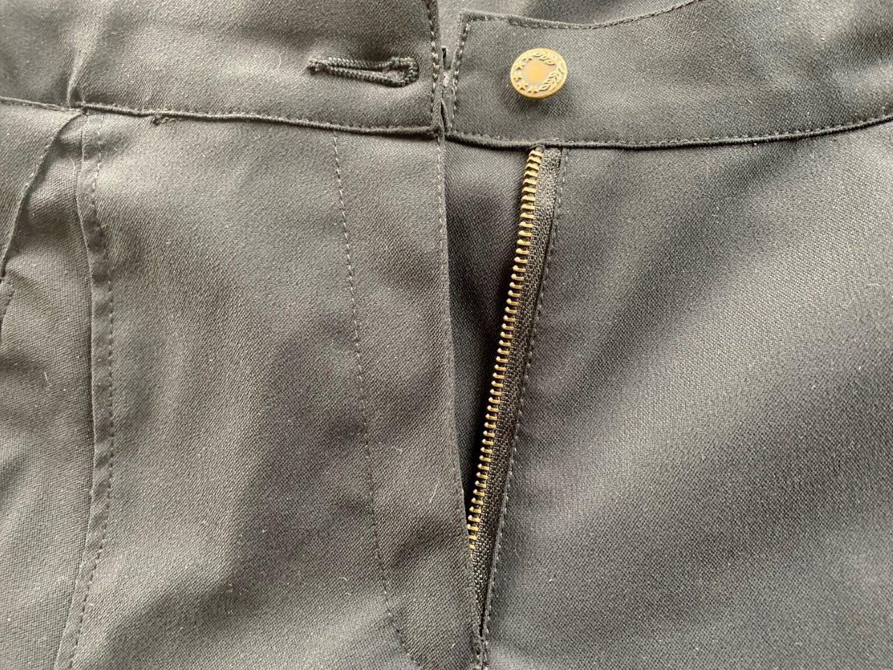 The front fly is closed with a 6” zipper and brass colored (unbranded) top button. Located on the side seams at the bottom of the pants are 10” boot zippers. The zippers should be long enough and the pant legs wide enough to accommodate fairly large boots. I had no trouble getting them over my rather porky Harley boots.