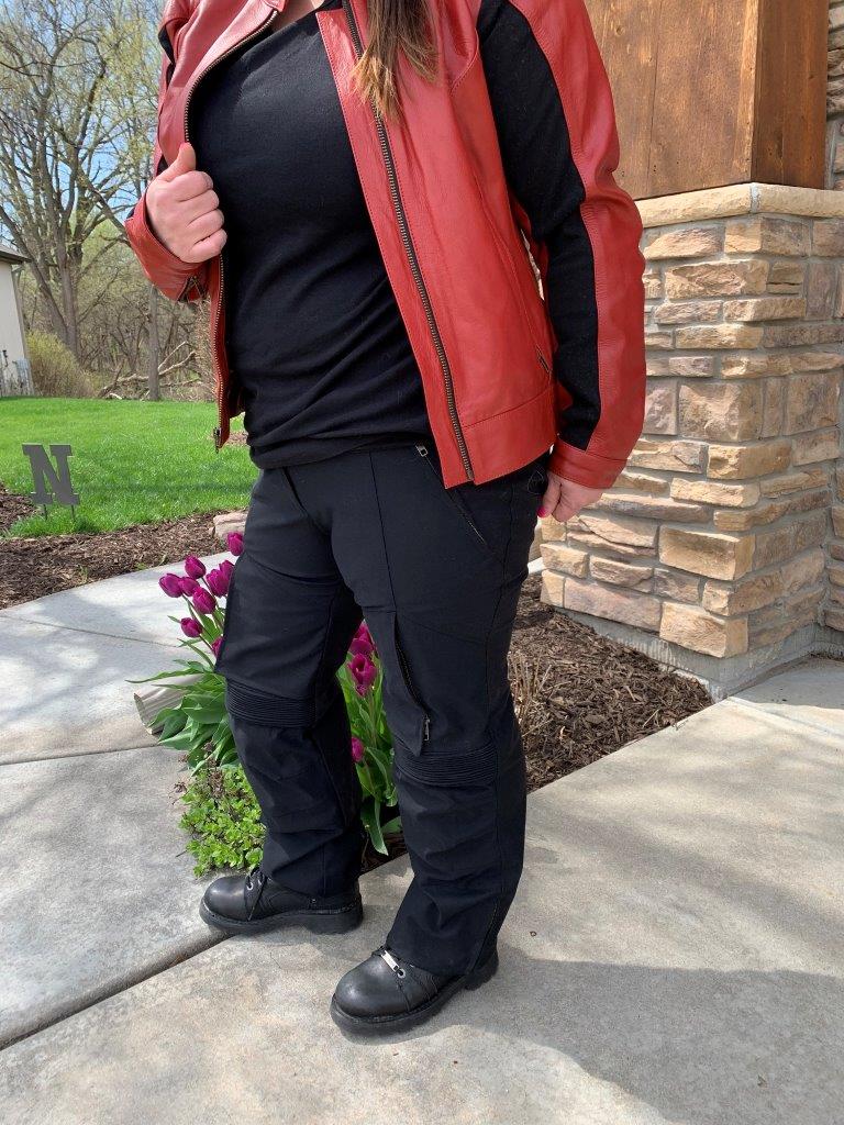 The other problem is the length – they only come in one. For an average height woman, say 5’6 and up, they would fit great with their 30” inseam, but I’m definitely a petite with my 27” inseam. This problem isn’t unique to these pants. I always have to hem my pants unless I buy a petite size, which are pretty hard to find in motorcycle pants. Even seated on the bike they are a couple inches past my heel. Motorcycle pants are hard to hem for someone with as little skill as me so it would be nice if they came in different lengths.