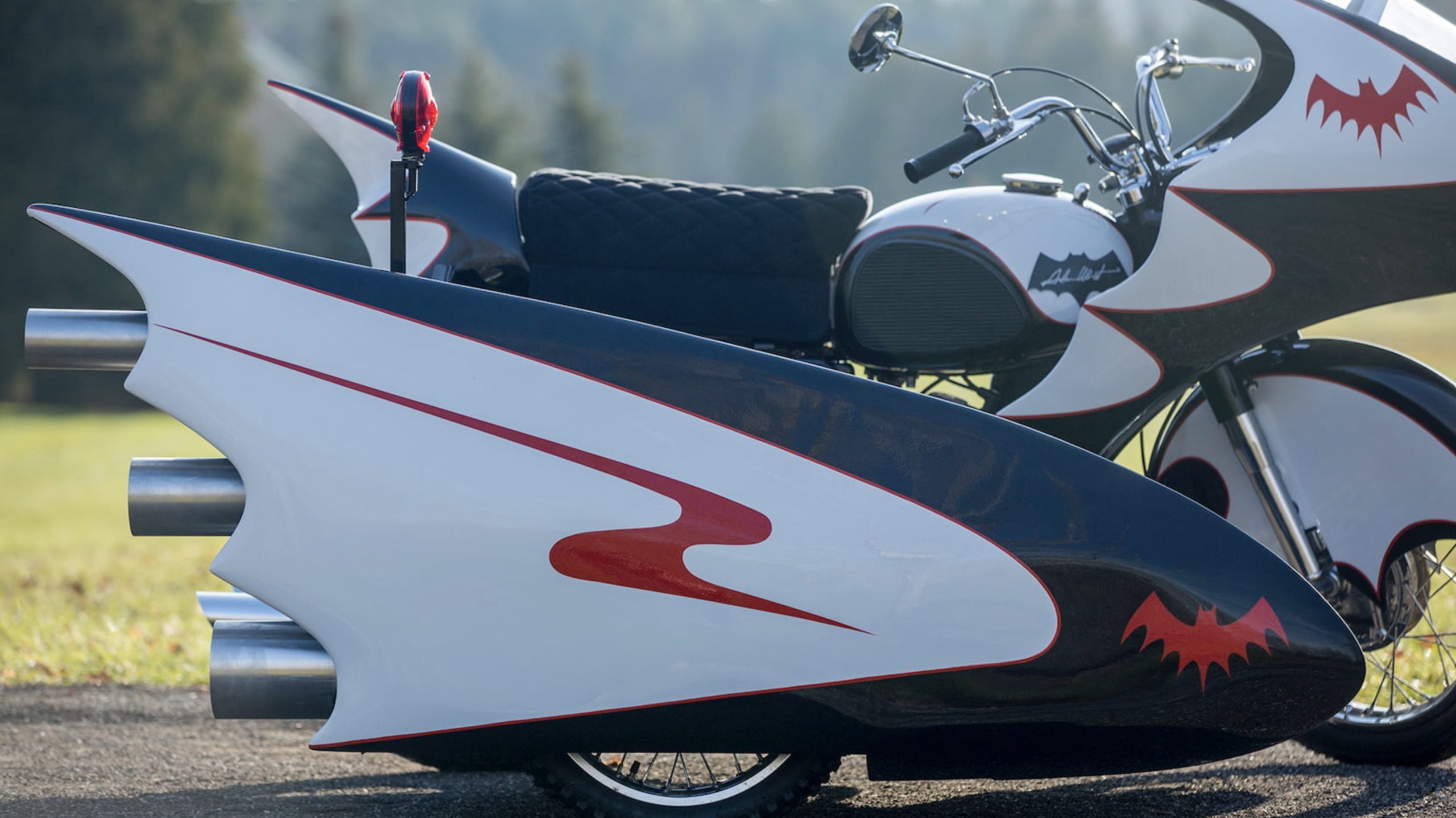“Four Batcycles were built by Dan and Korky Korkes of Kustomotive and were toured around America after the series ended…then a sidecar was fitted for Robin to ride on, and this incorporated a four-wheel go-kart-type sled that could be ’fired’ from the sidecar chassis to go on its own way under its own power with a 55cc motor.”