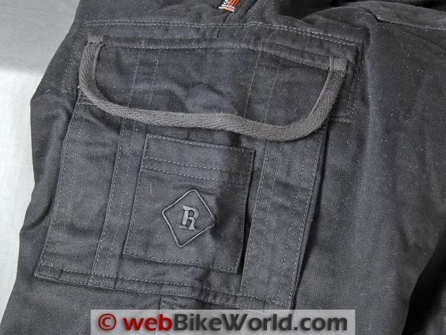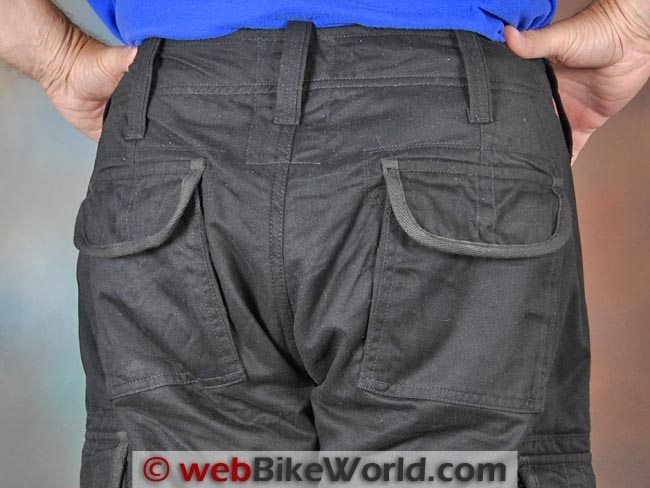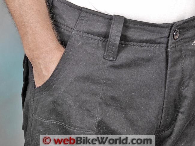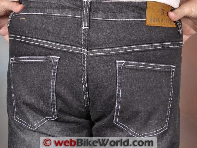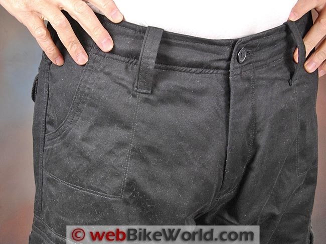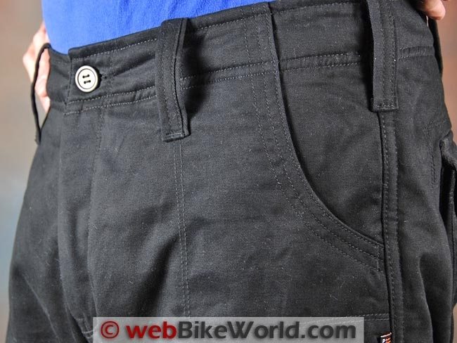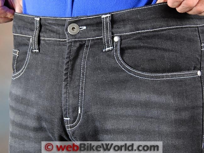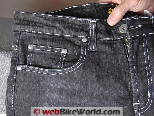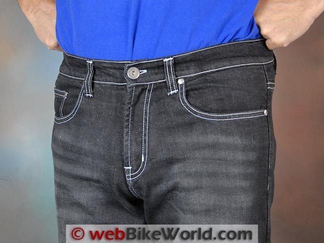 The outer denim fabric is listed as “100% comfort stretch cotton”; it apparently has some Spandex or other type of stretch fabric incorporated in the weave. This makes the jeans fit very comfortably both on and off the bike and it can also help keep the protectors correctly located.