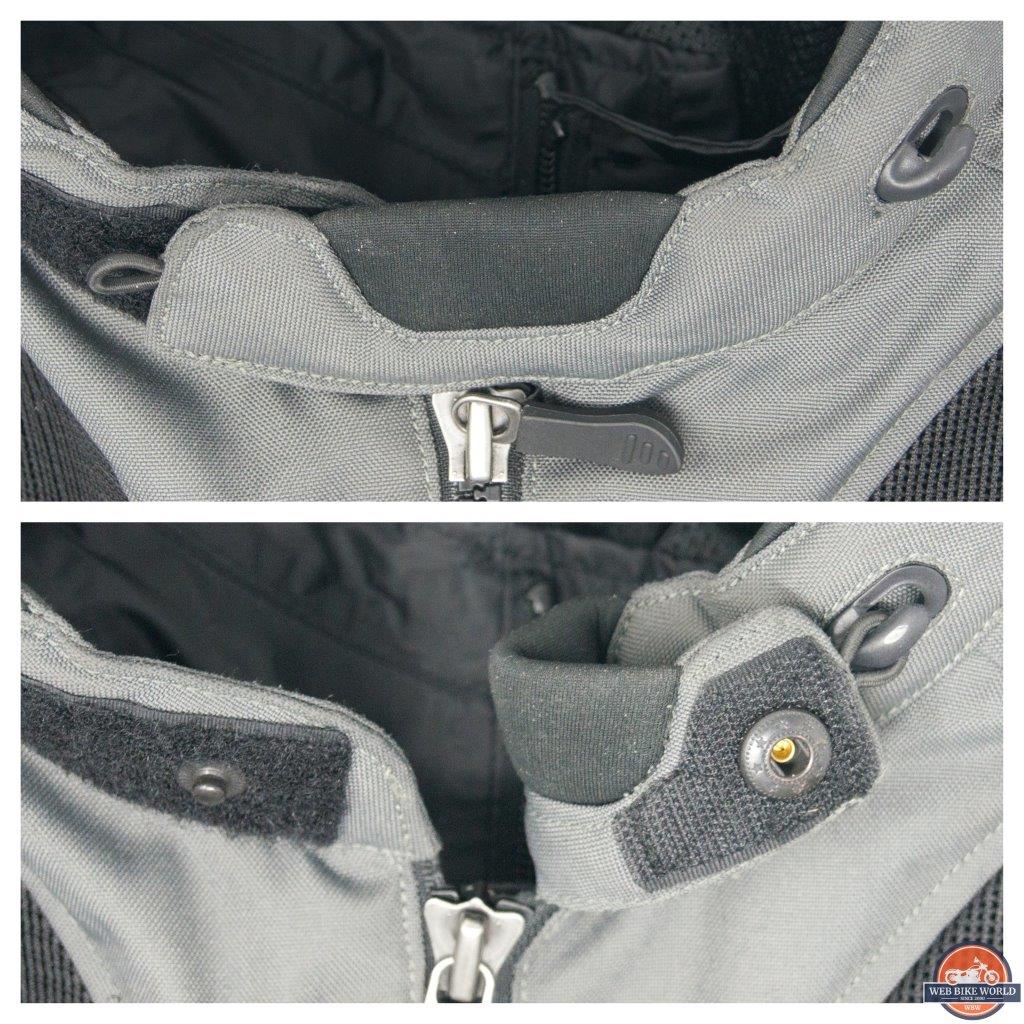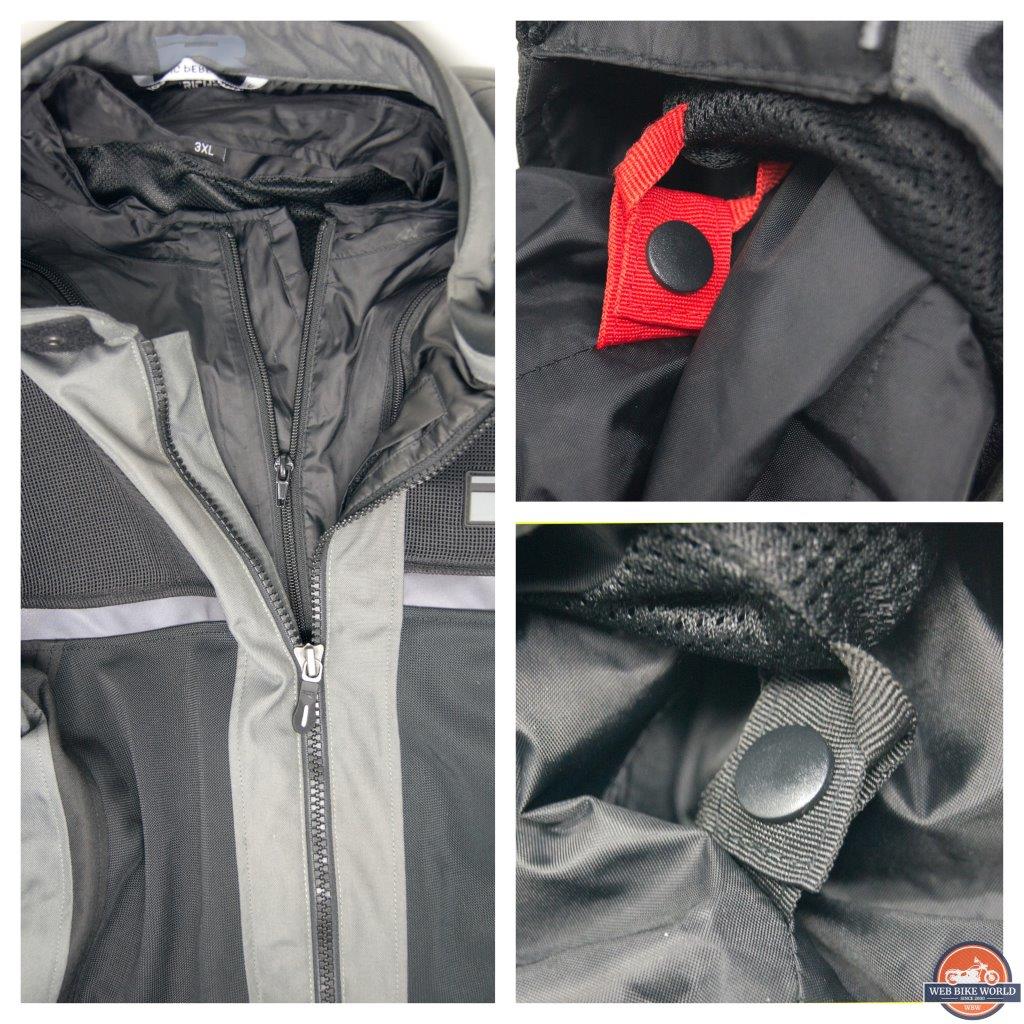 The Richa Airstorm WP uses a zipper in an AquaShell waterproof inner liner. The liner attaches with a single zipper that runs up one side, around the collar, and down the other side. The liner also fastens at the bottom of the arms with color-coded snaps and loops.