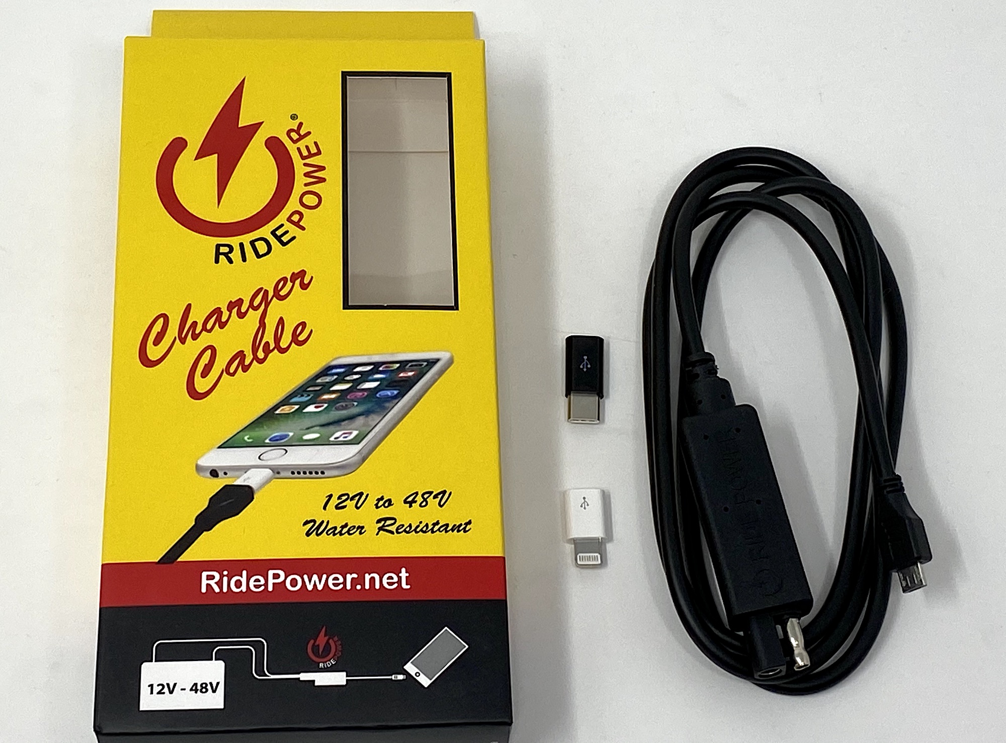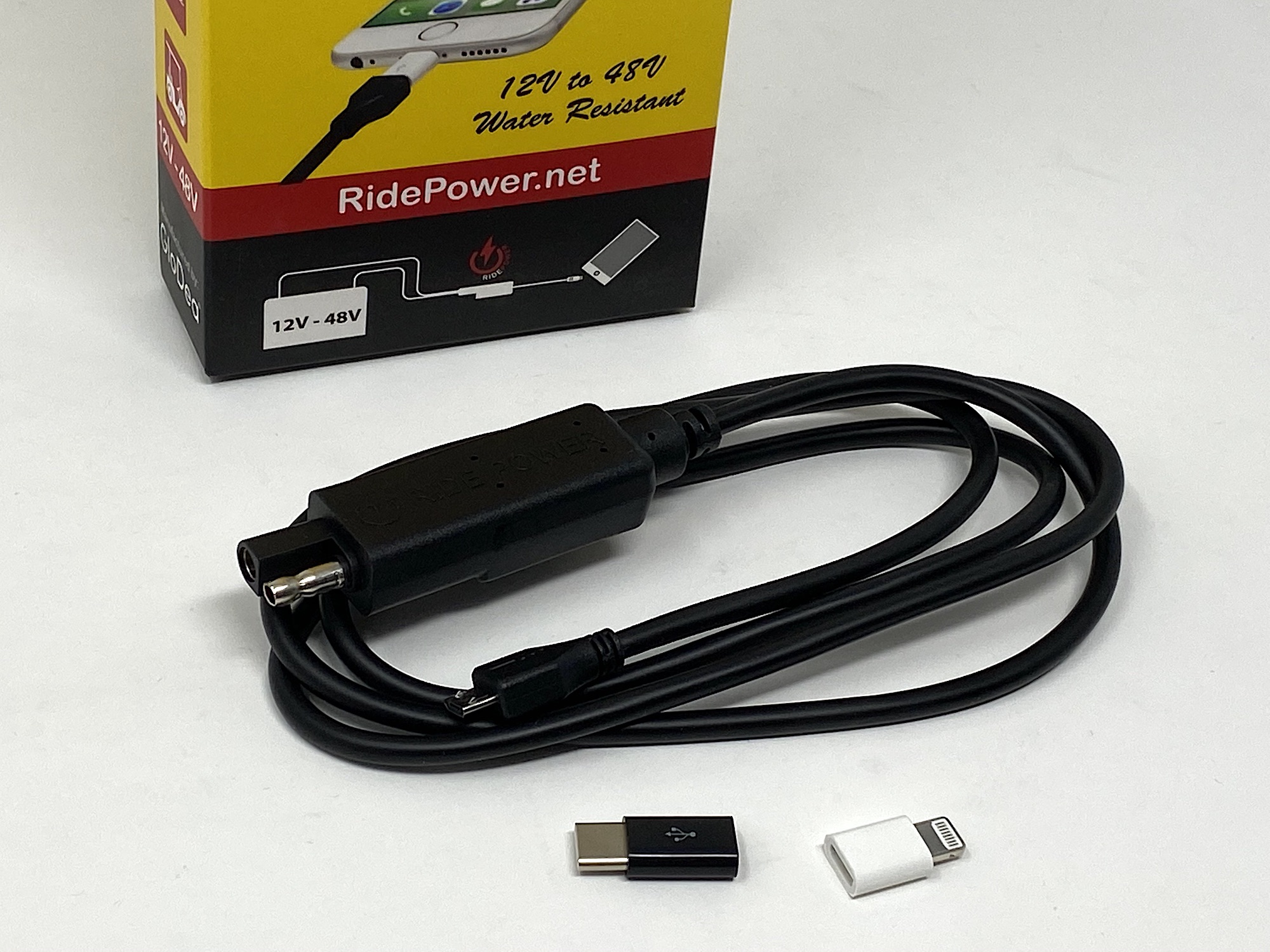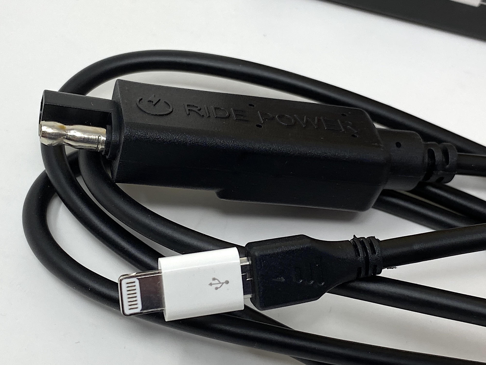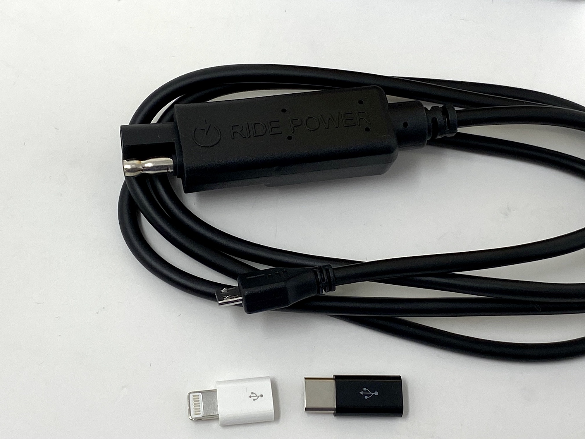 The last cable that RidePower sent was a cable that had the SAE connection on one end and a micro USB on the other. There were a couple of adapters so that you could make the cord work for either a USB-C or a lightning connection.