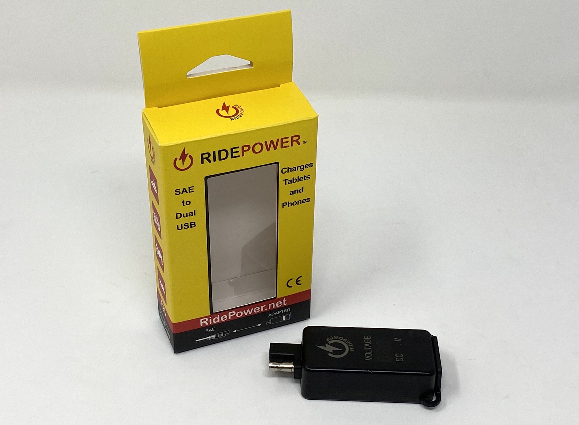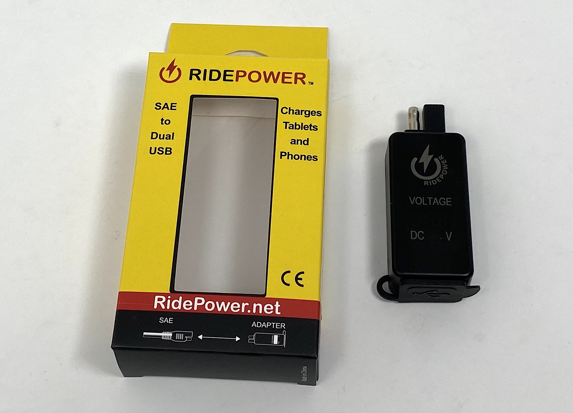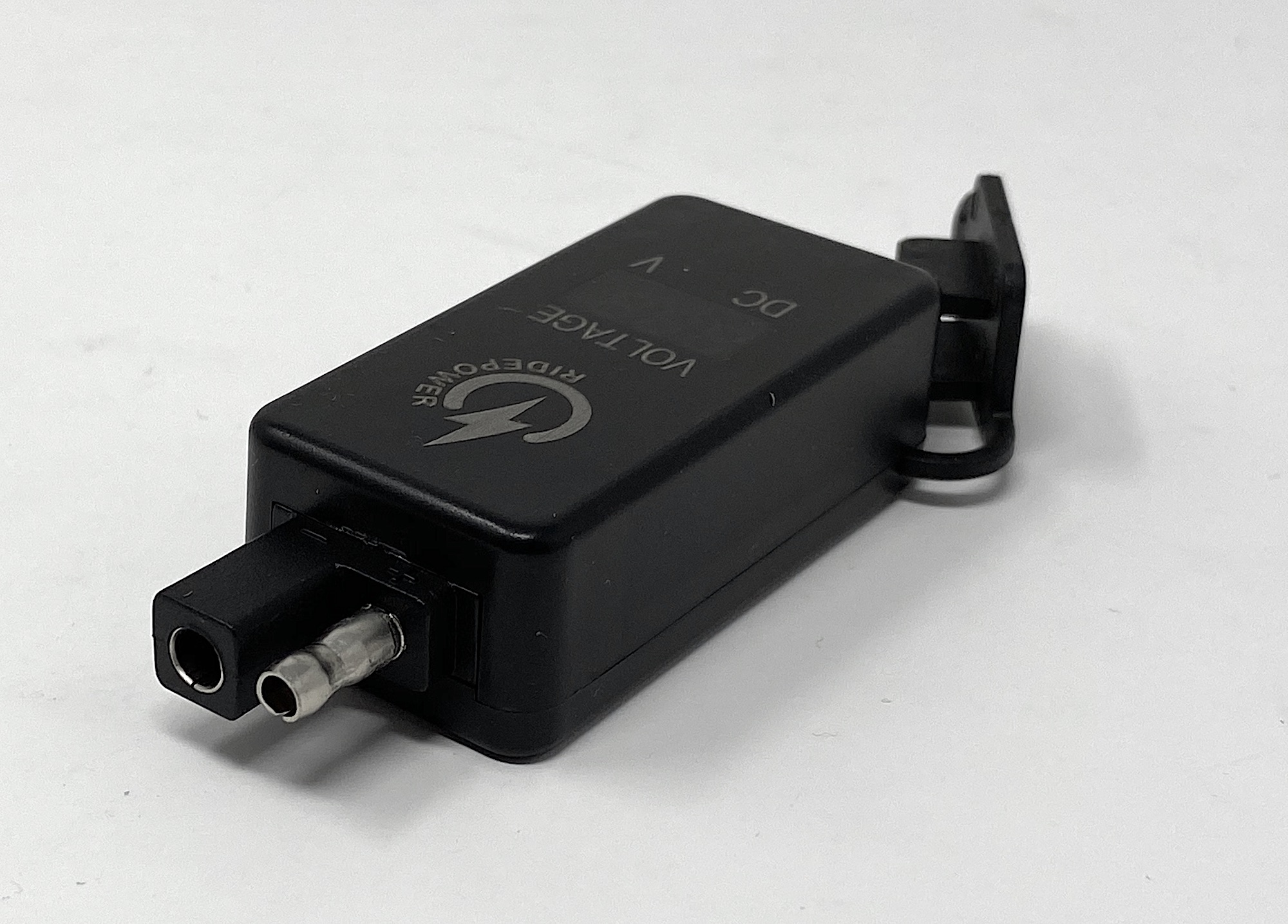 First up we have the SAE to dual USB adapter. This little black box connects to a standard SAE power connection that attaches to your battery. From there it displays the voltage coming off your battery and provides two different USB 2.0 ports to plug in your electronics.