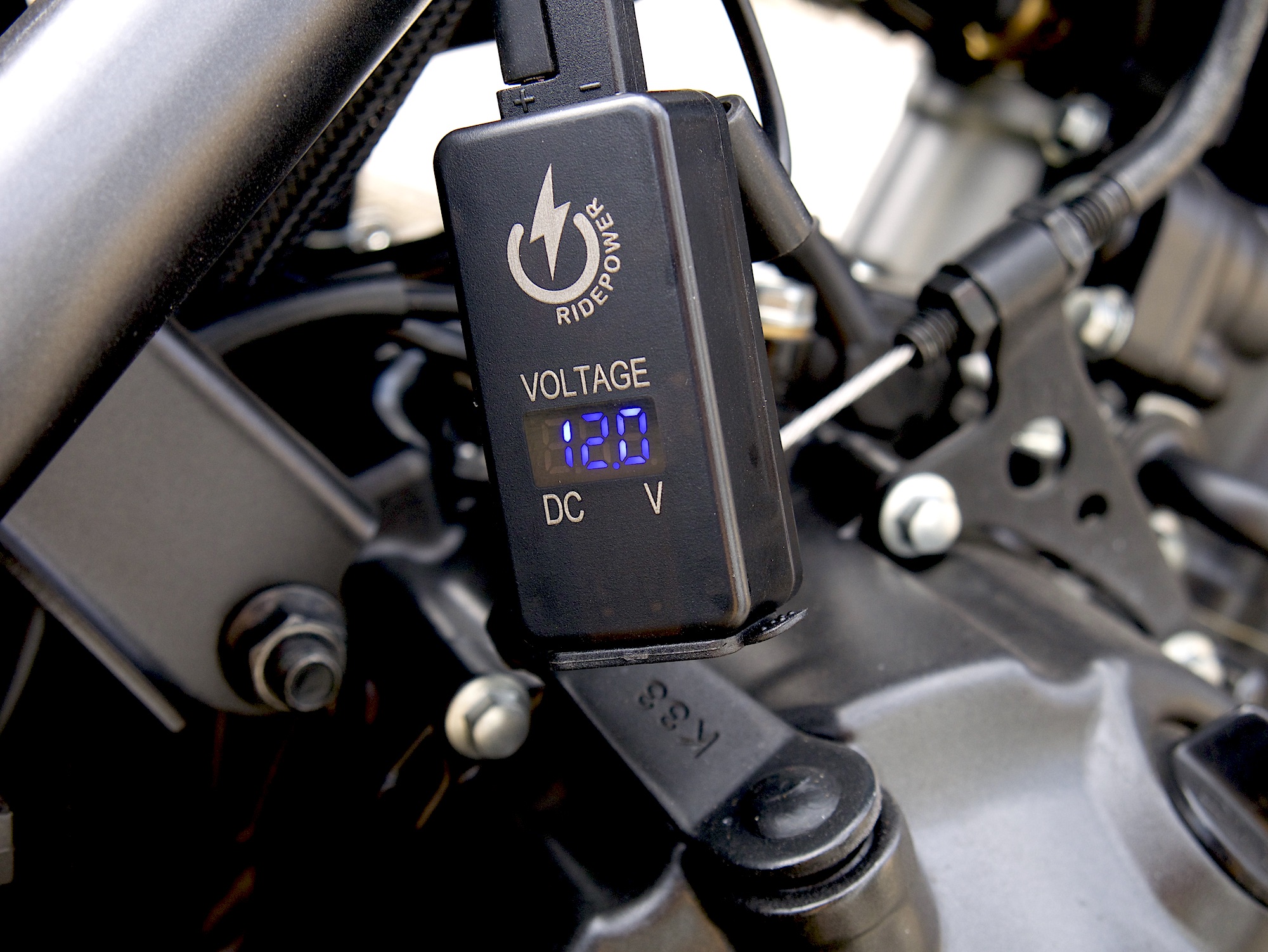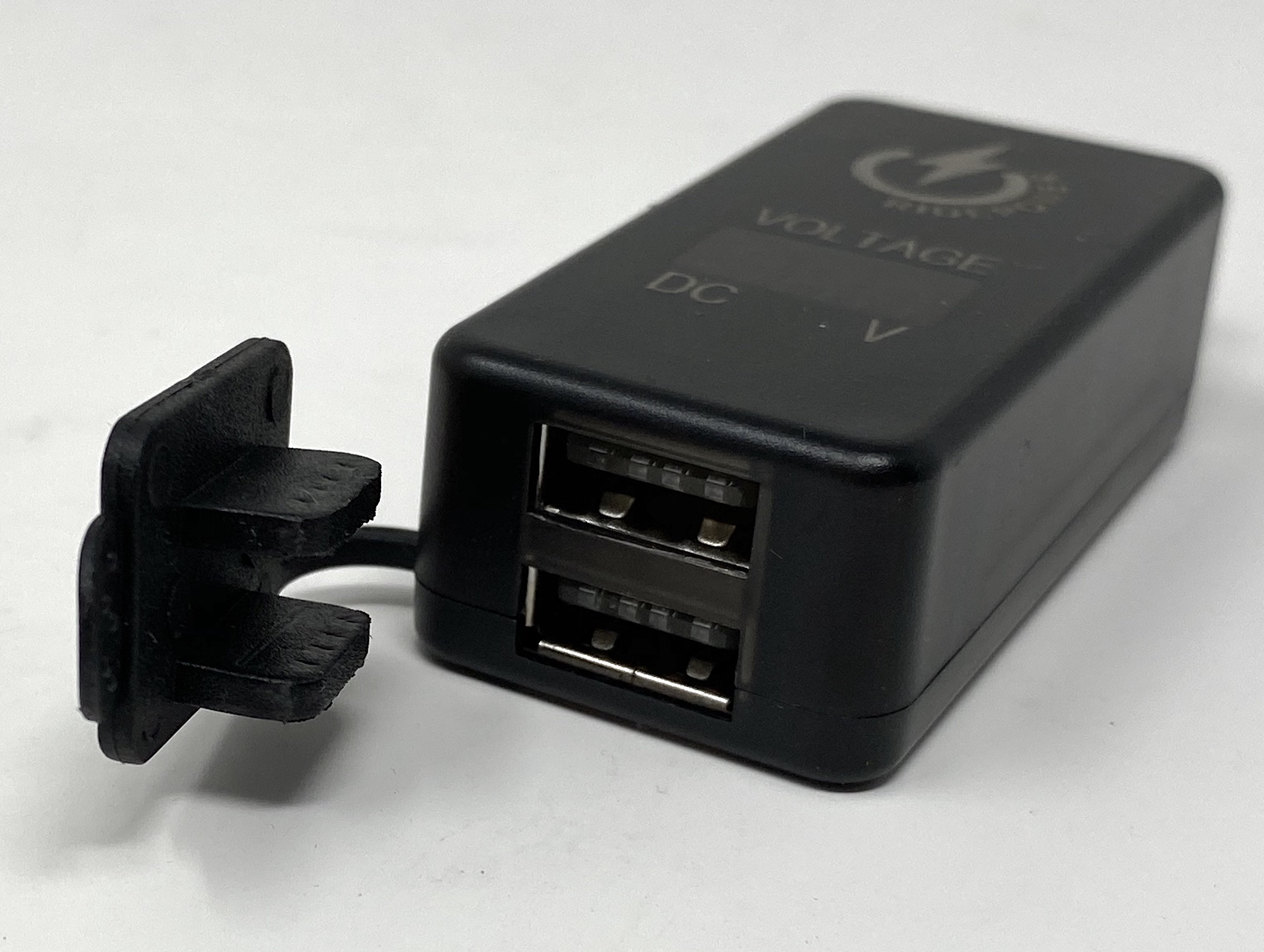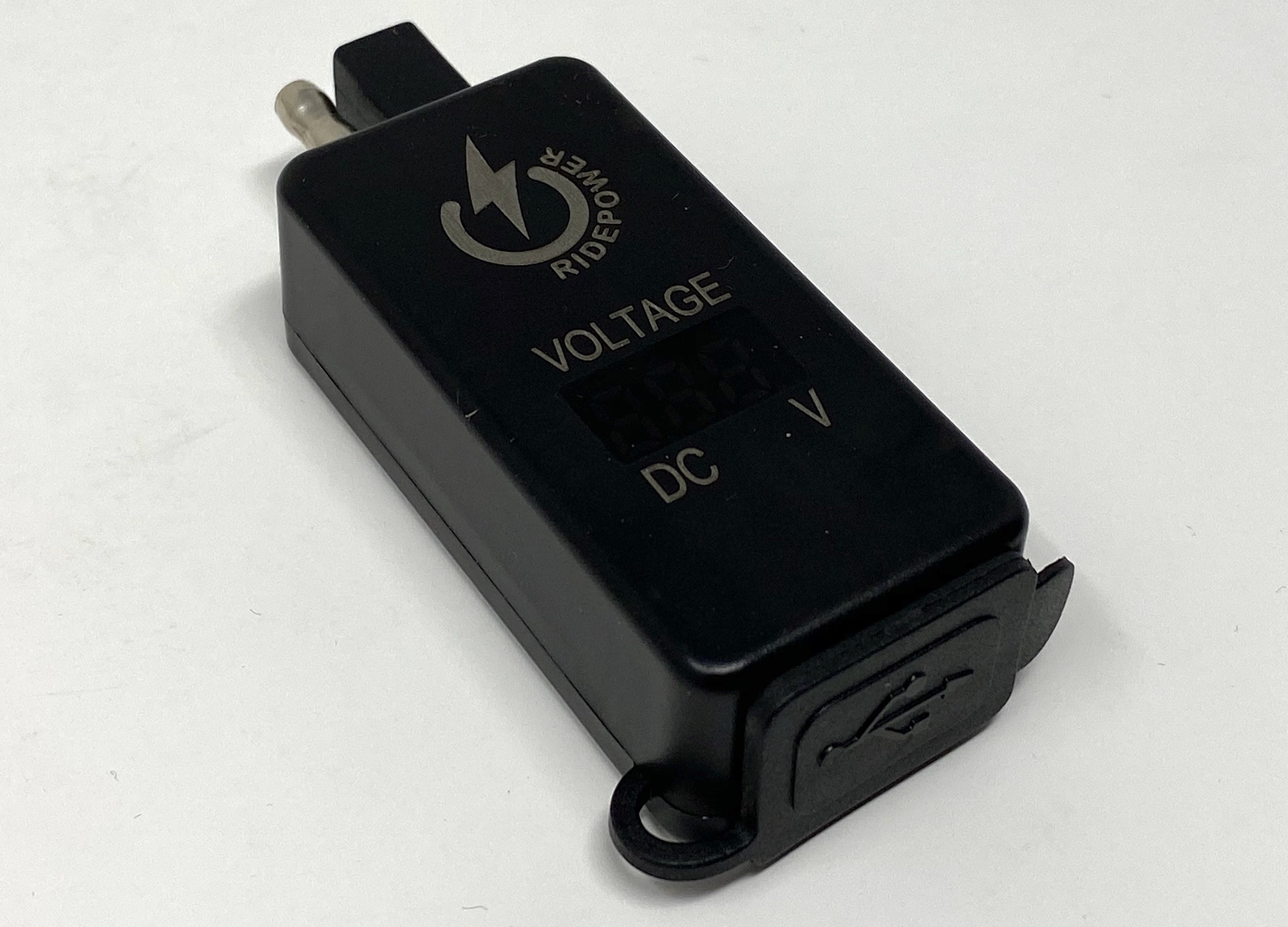 First up we have the SAE to dual USB adapter. This little black box connects to a standard SAE power connection that attaches to your battery. From there it displays the voltage coming off your battery and provides two different USB 2.0 ports to plug in your electronics.
