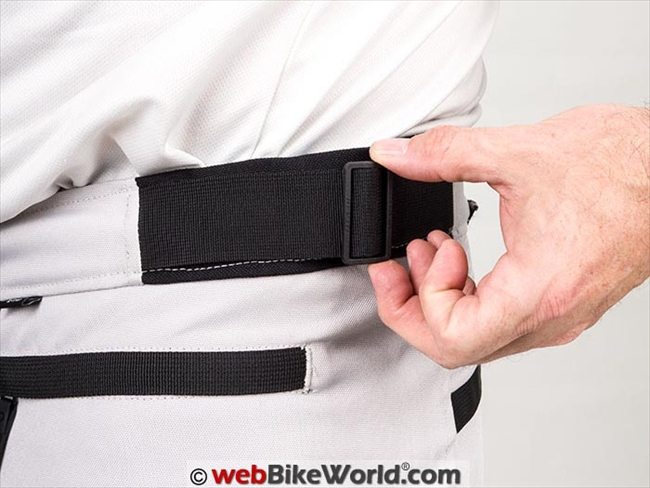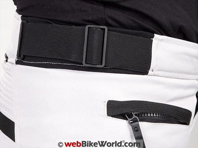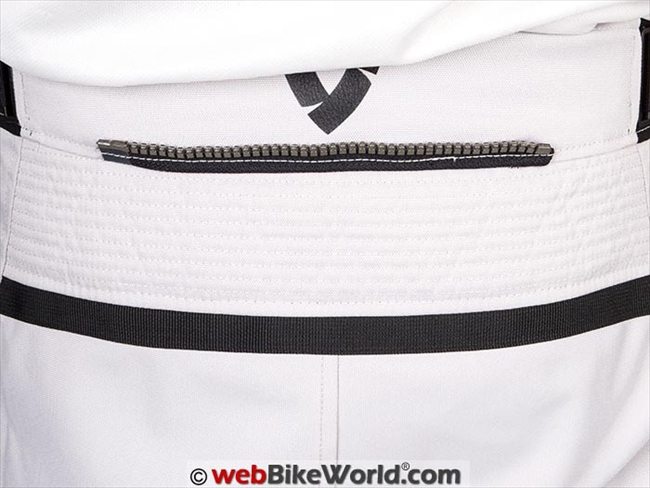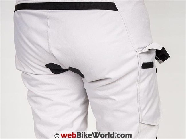 There is a short connection zipper for attaching to REV’IT! jackets on the back of the pants. Below the attachment point is a section of accordion style material, although it looks like it would stretch but it doesn’t.