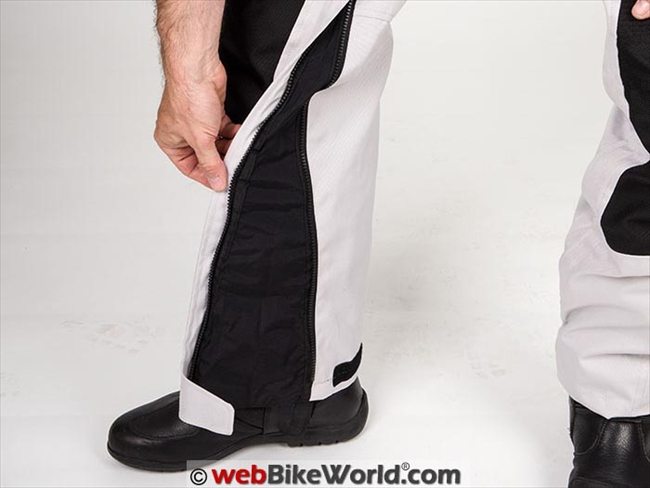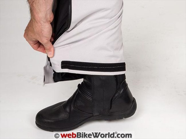 Once the pants legs are zipped up, the leg opening can be adjusted to fit closely around boots.