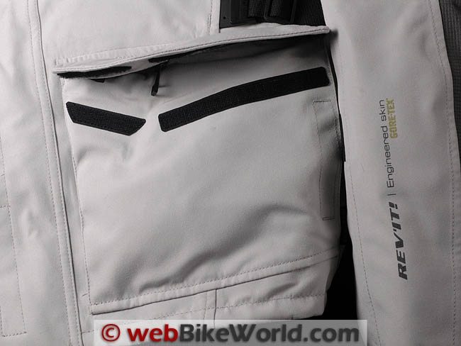 The Everest GTX jacket has two front pockets (waterproof) with open hand warmer slots behind. The only other pockets are inside the jacket, one on each side, covered with a horizontal zipper. The jacket does not have the vertical wallet pocket in the placket that is featured on most of the other Rev’it jackets.