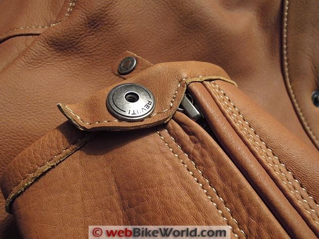 All except the horizontal pocket close with metal zippers that appear to be made from brass (or an indistinguishable equivalent) and they have the standard REV’IT! metal wire pull with leather pull tabs embossed with a nice metal roundel.