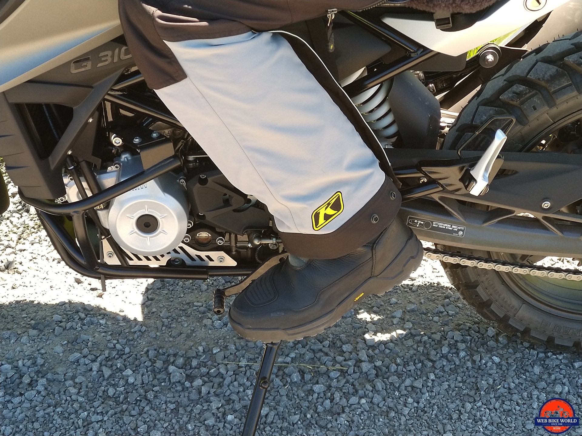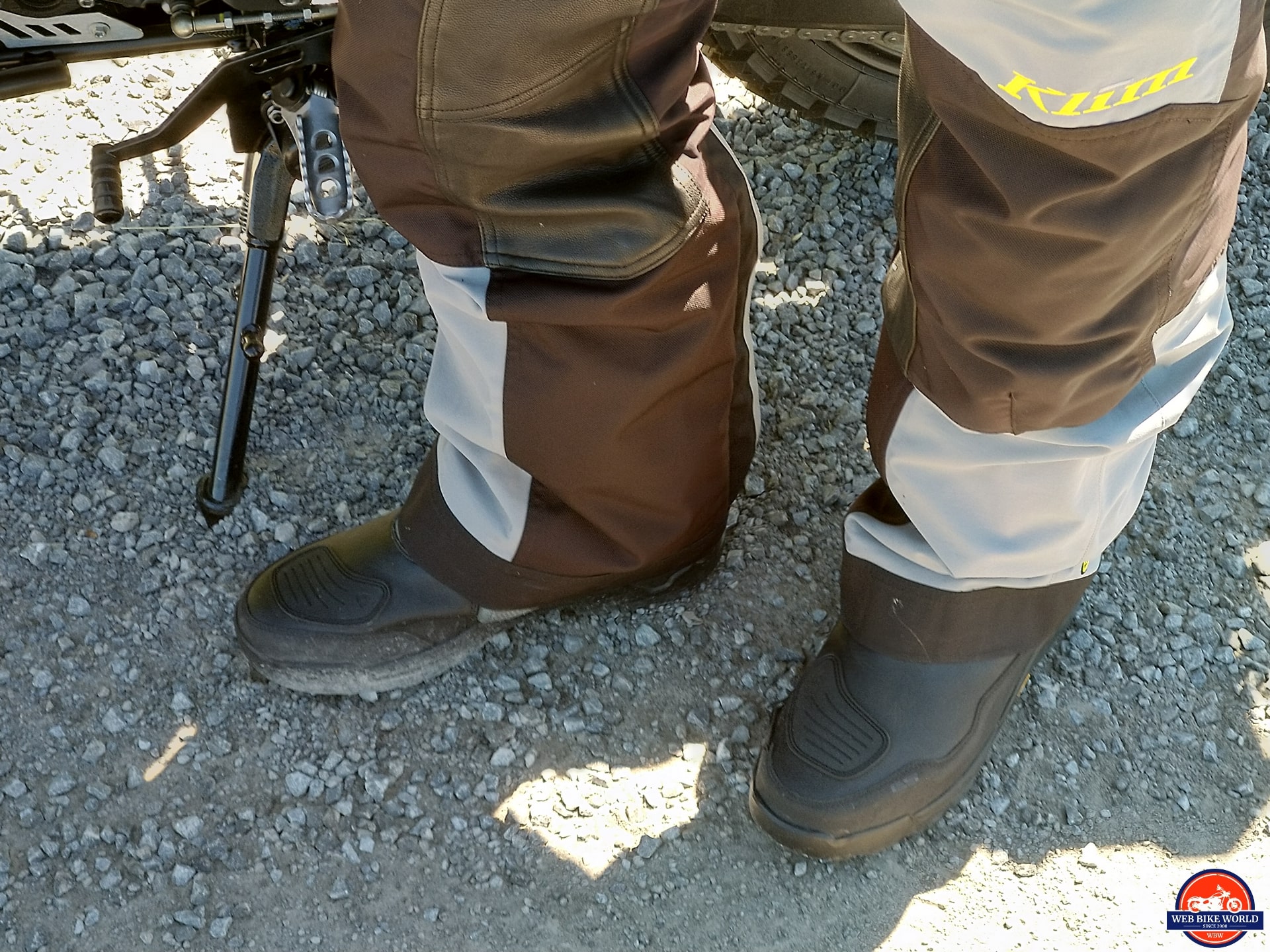 The lighter weight REV’IT Offtrack Adventure Pants and KLIM Latitude Gore-Tex pants are accommodated by the boots when worn inside, but anything heavier, including the Motonation Cappra or Tourventure pants can be tucked in but perhaps with zipper and overflap issues.