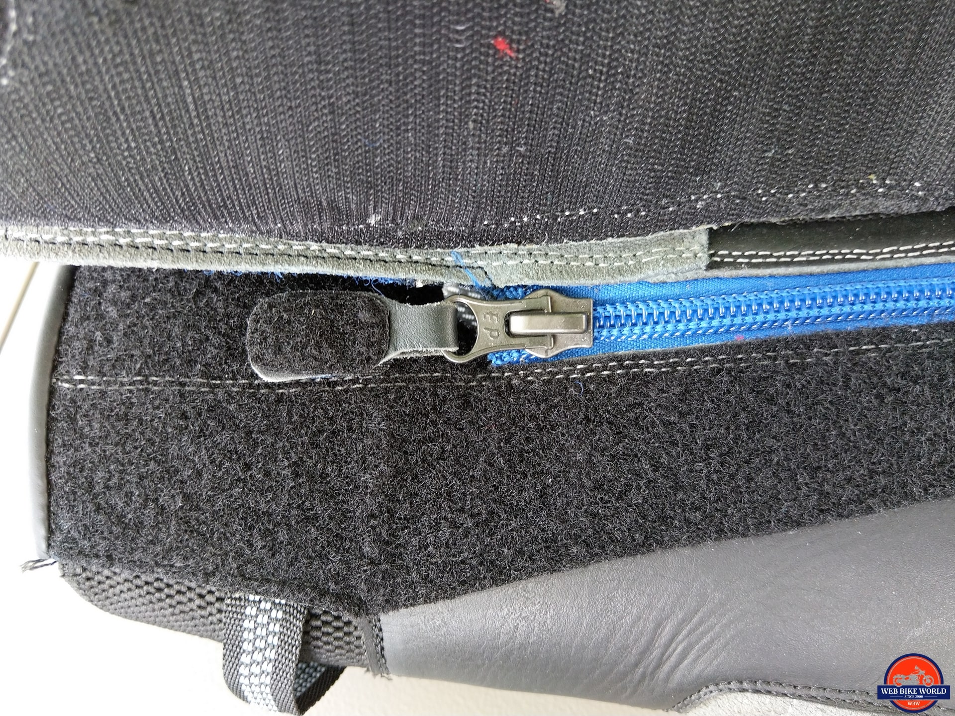 Behind this larger than life zipper, is a leather gusset providing a good seal as additional protection from the elements. A protective edge is stitched right behind the zipper for clearance, so the zipper doesn’t ‘grab’ the gusset and complicate things.
