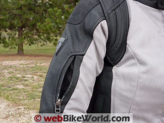 The chest and back are mesh for good breathability. The jacket has stretch material incorporated behind the shoulders, under the arm, and inside the arm for comfort and flexibility.