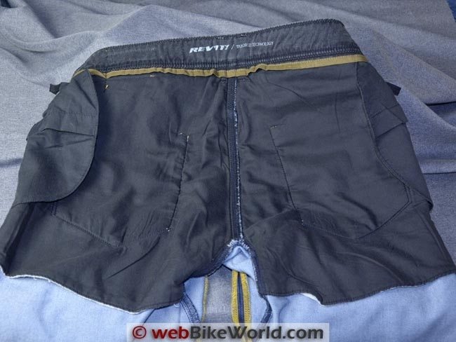The hip pockets in the Memphis H20 jeans can fit a set of the $19.98 Seesoft hip protectors (see the Seesoft back protectors review for more info), although the pockets are confusingly labeled “Tryonic”, the other REV’IT! back protector company.