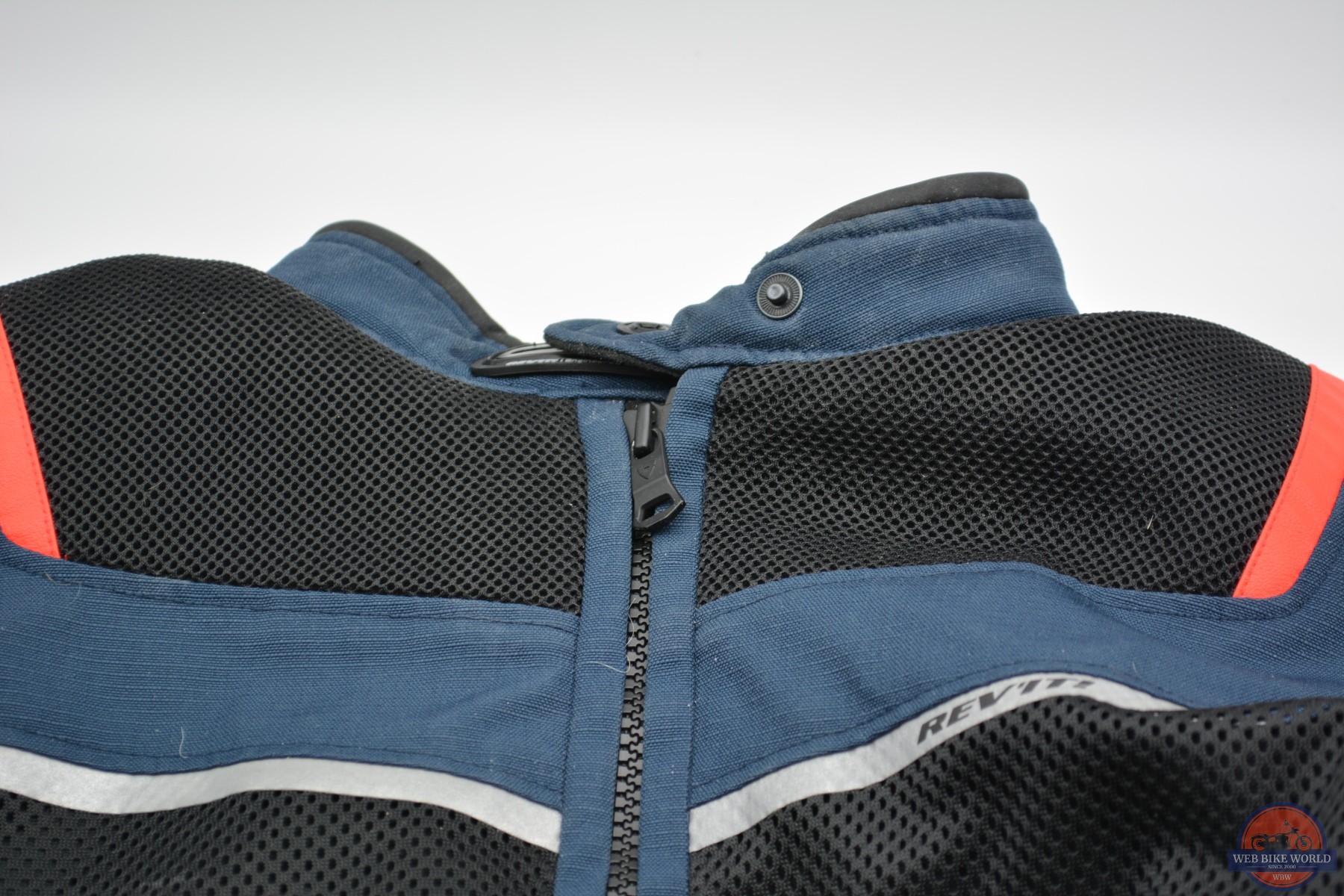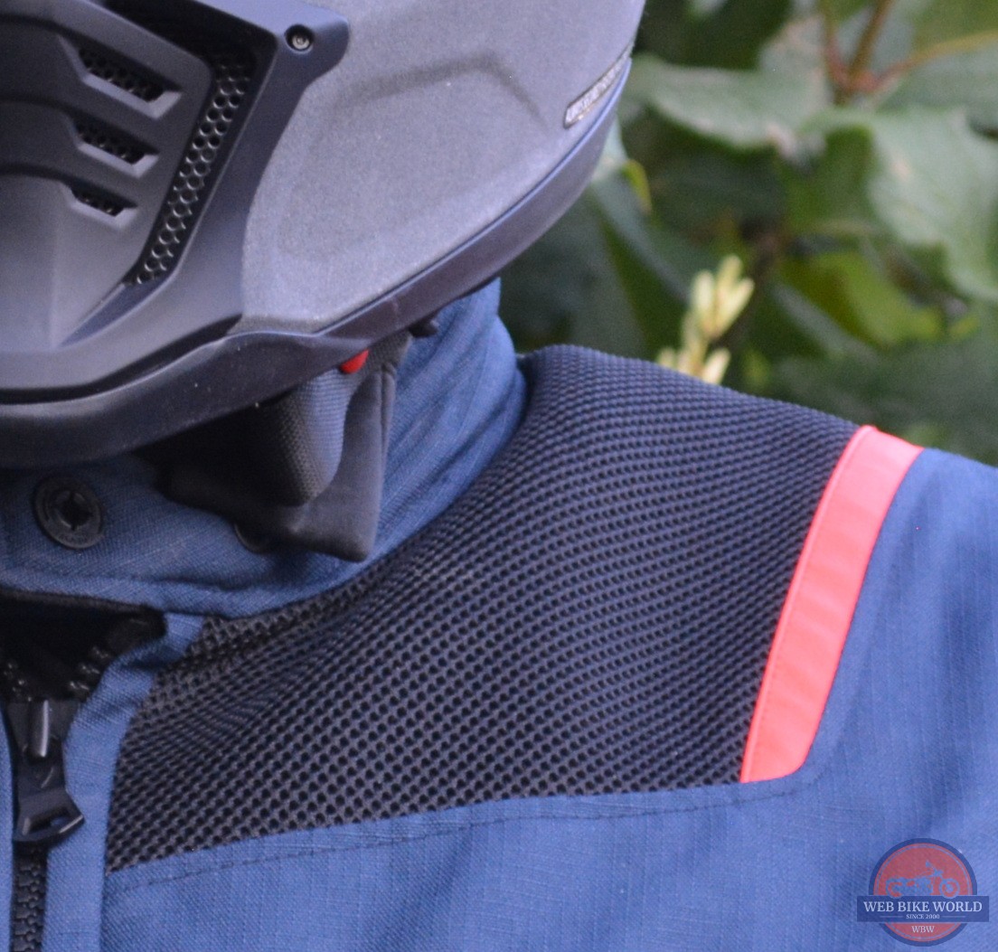 This “necklace” of ventilation allows for hot air that might get pushed up by incoming air from the front panels or arms to escape out of the top of the jacket, and get carried away by the wind. This is especially nice behind the neck, as most back protectors are not porous and can cause a bit of a hot air pocket between the shoulderblades. With, in effect, the “chimney” out the top back of the jacket, no such hot pockets have a chance to form.