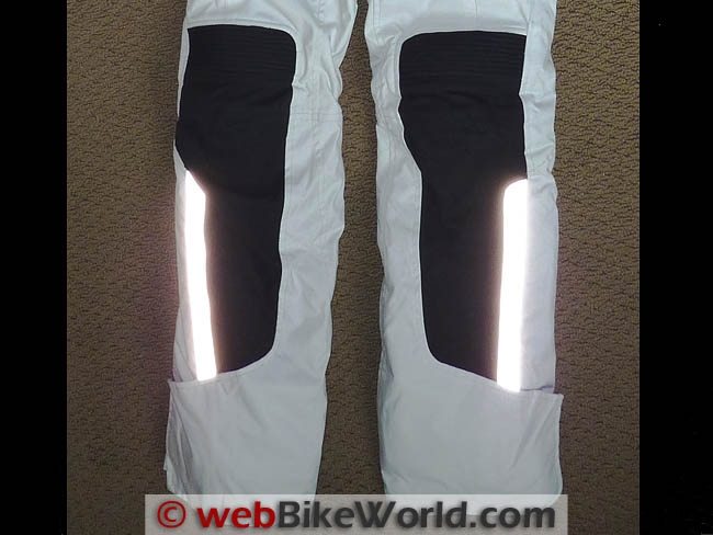 The position of the knee armor can be adjusted inside the protector pockets — a nice feature. The pants also have the laminated reflective strips found on the jacket. On the pants, the strips are located along the lower legs and they are very bright under lights and can be seen from any angle. It’s nice to know that drivers will see you at night!