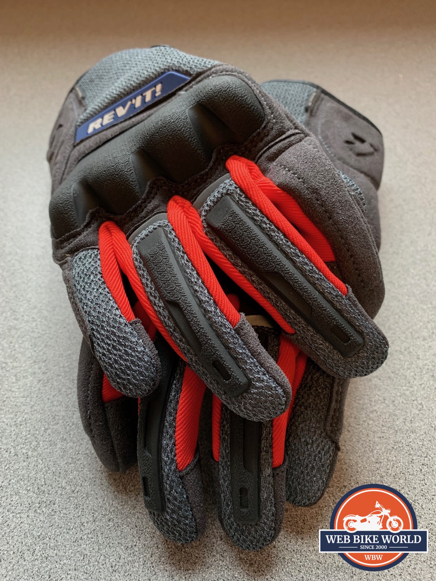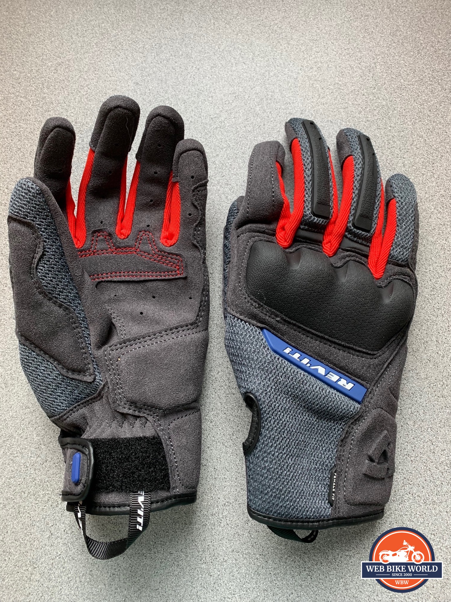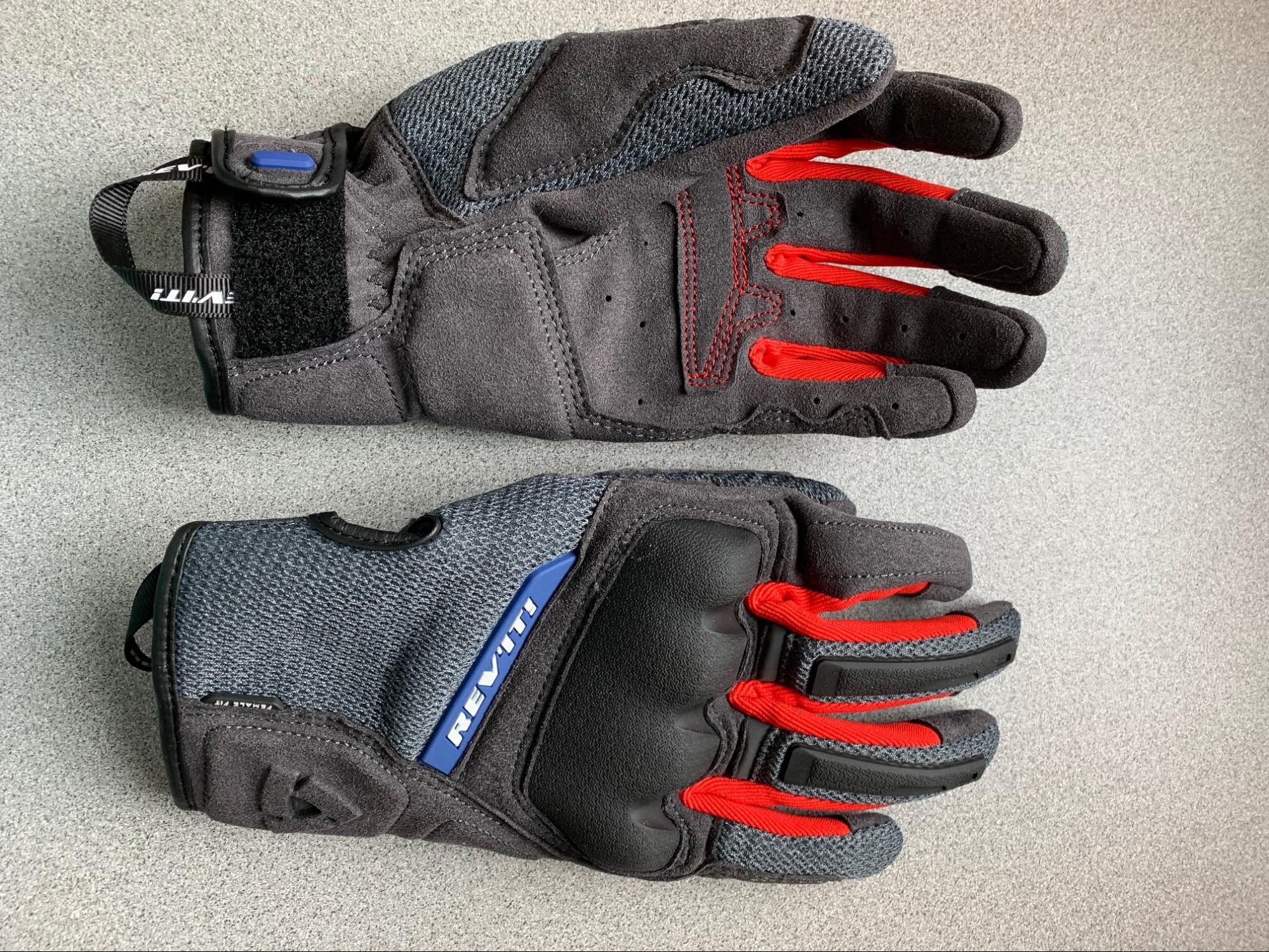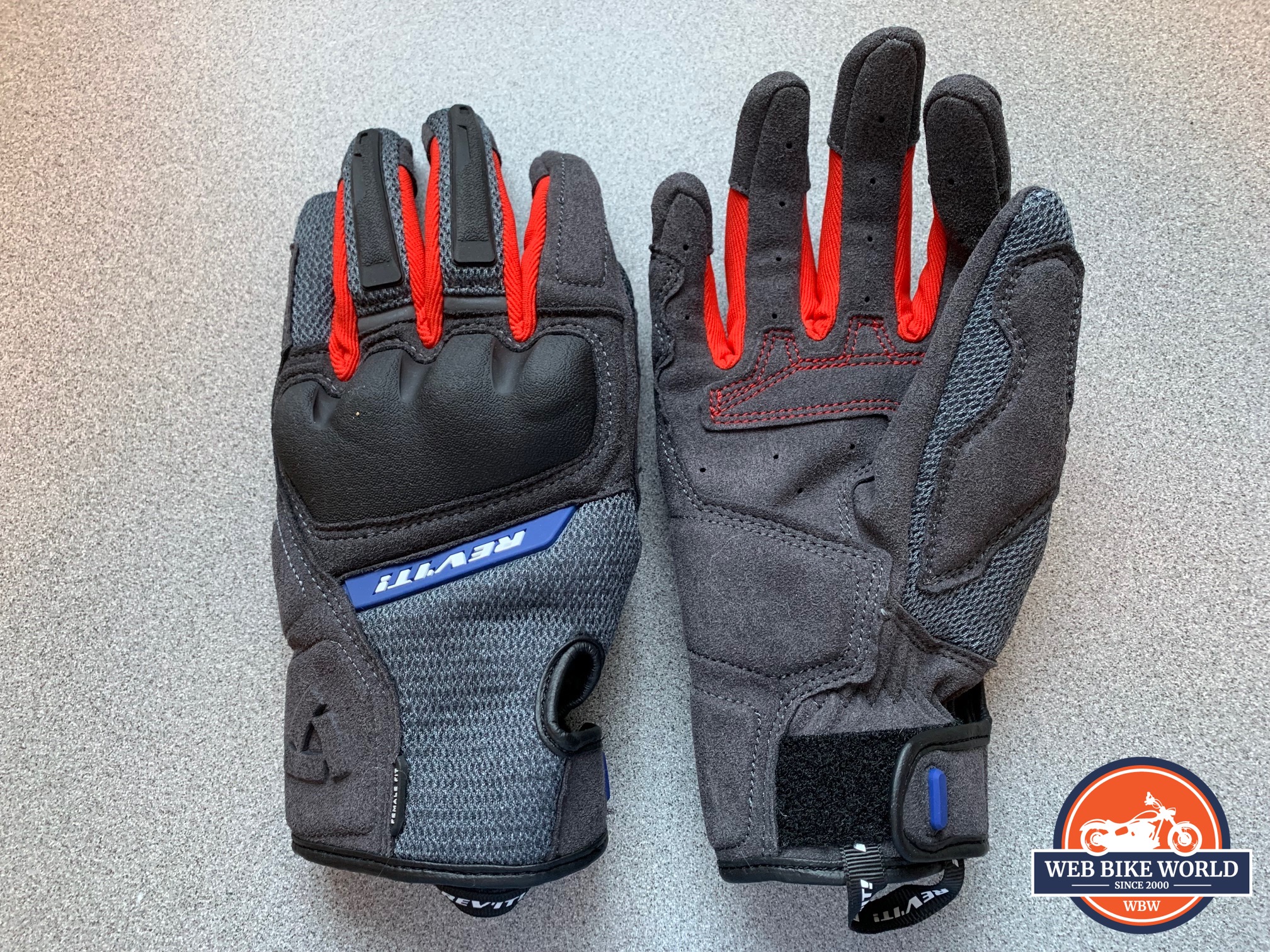 Branding is limited to a small blue strip below the knuckle protector with REV’IT! on it. It also appears on the pull strap. They include a stamped REV’IT! Logo on the cuff as well.