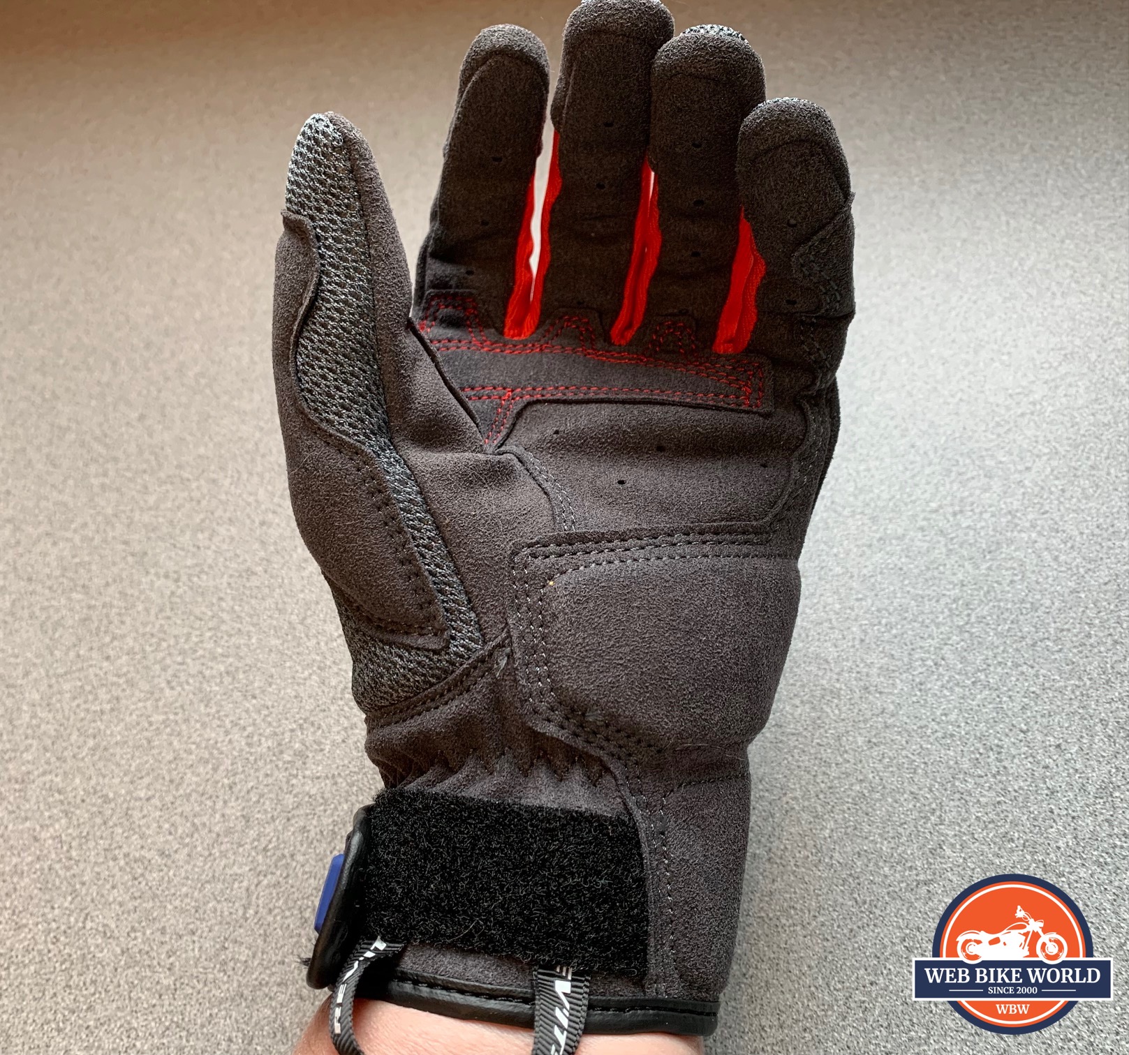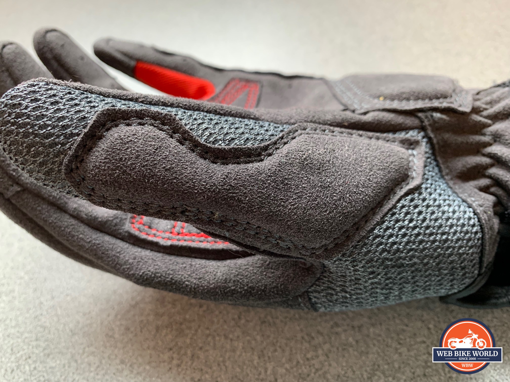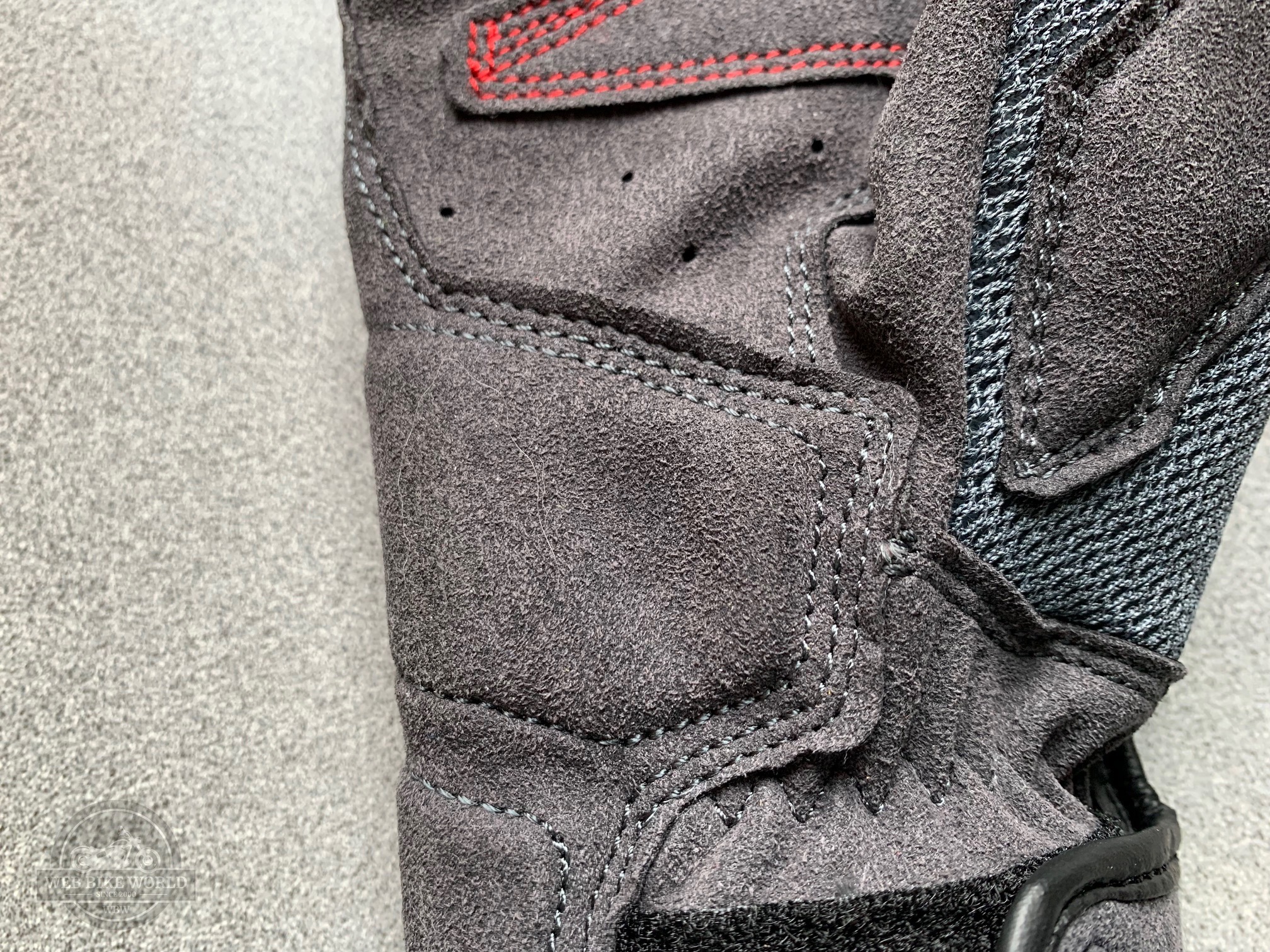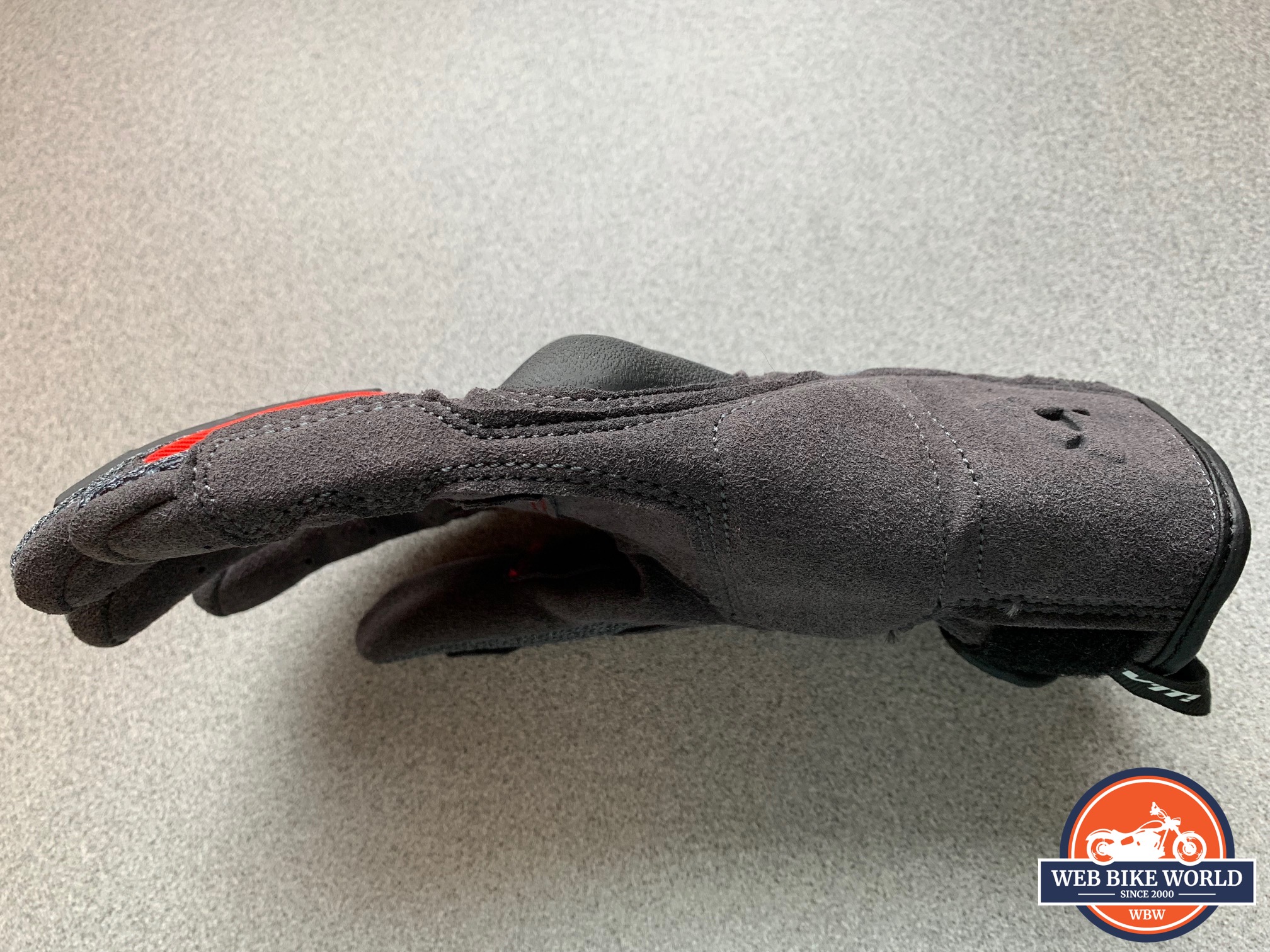 The outside of the little finger has an extra layer of suede with a small amount of padding beneath, as does the outside of the thumb. There is no hard slider for the heel of the hand, but there is an extra layer of suede and it’s pretty well padded. These are billed as ADV gloves, and heavy padding may be more appropriate for a get-off in the dirt than a hard slider.