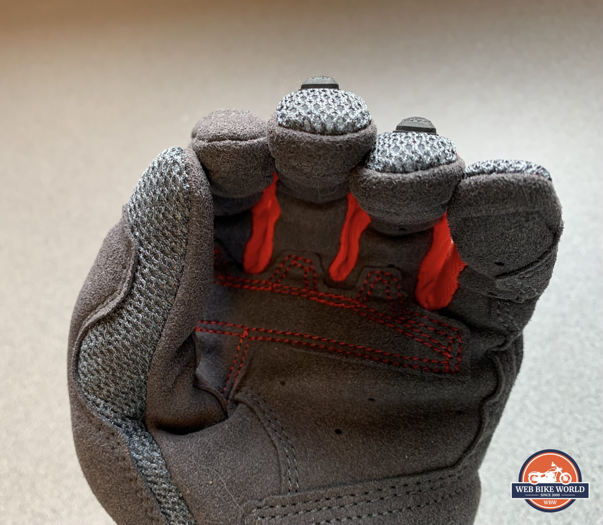 All the fingers are formed with a ‘top’ and a ‘bottom’ and have a stretch material between them which is represented by the red material in the photos. All but the first finger have 3D air mesh on the top side. The middle two fingers also have TPR sliders that we’ll look at more closely in the ‘protection’ section. The ends of the fingers all have Connect fingertip fabric that works quite well for touch screen use – hopefully when your bike is stopped.