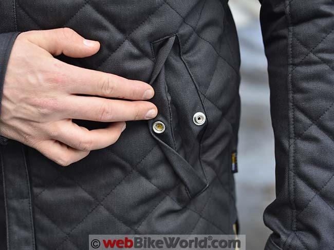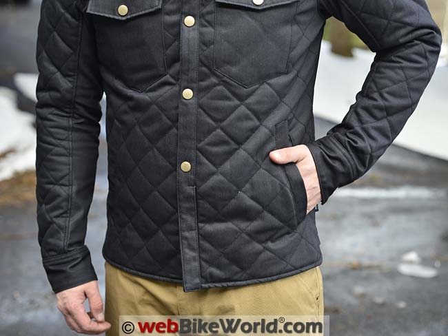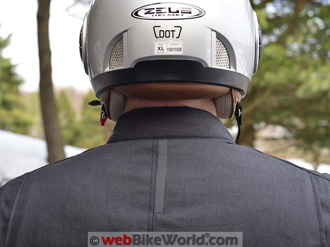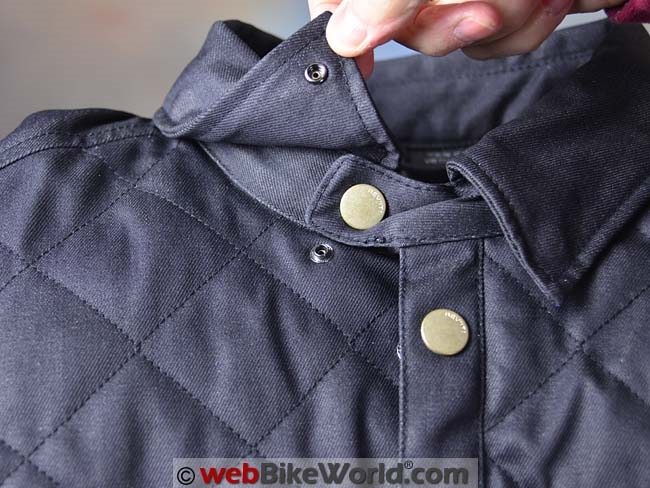 Under the front main entry flap is a zipper, so the combination of the entry and the zipper adds some wind protection. Also on the outside, the upper arms have a nice expansion gusset that provides extra room for the arms when you’re reaching for the handlebar. One more external feature is the collar, which again is unique in the world of motorcycles as far as we know and is probably the most distinguishing shirt-jac or overshirt feature: a button-down collar.